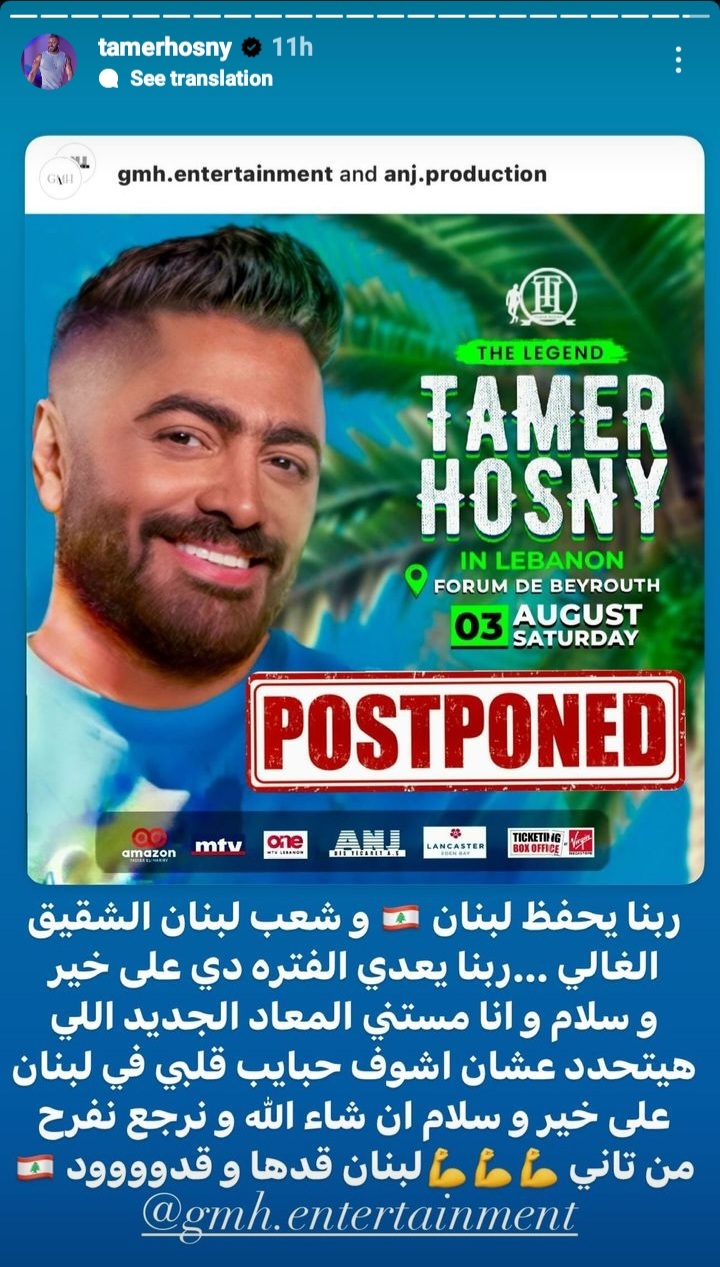 وقال تامر حسني في ستوري عبر صفحته الرسمية " ربنا يحفظ لبنان، وشعب لبنان الشقيق الغالي، ربنا يعدي الفترة على خير وسلام وأنا مستني الميعاد الجديد اللي هيتحدد علشان أشوف حبايب قلبي في لبنان على خير وسلام وإن شاء الله نرجع ونفرح من تاني، لبنان قدها وقدود".