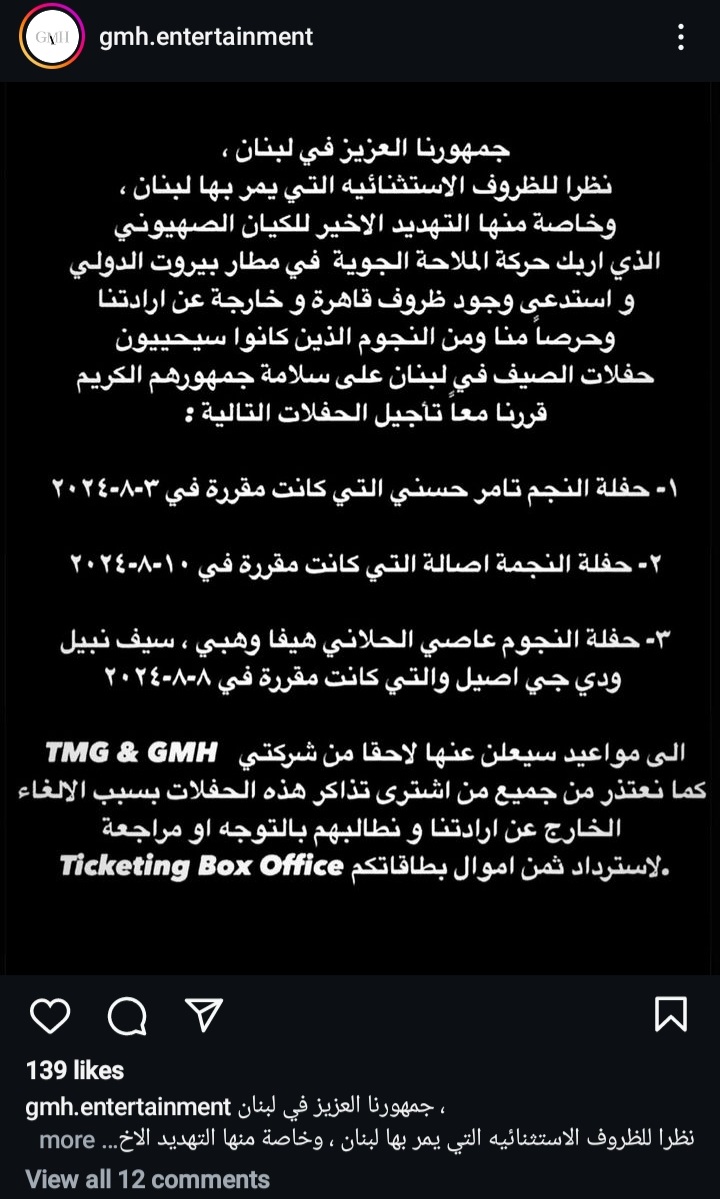وقد أعلنت شركتا "GMH" و"TMG" تأجيل حفلات كانت مقرّرة في الفترة المقبلة في لبنان عبر بيان رسمي جاء فيه أنه نظرًا للظروف الاستثنائيّة التي تمرّ بها لبنان، والتي أربكت حركة الملاحة الجوّية في مطار بيروت، وحرصًا من المنظمين، ومن النجوم الذين كانوا سيحيون حفلات الصيف في لبنان على سلامة جمهورهم الكريم، قرّرنا معًا تأجيل هذه الحفلات.