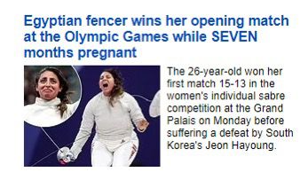 احتفت صحيفة ديلى ميل البريطانية، بلاعبة "سلاح السابر" المصرية ندى حافظ ، على خلفية تحقيقها فوزًا على إليزابيث تارتاكوفسكي من الولايات المتحدة الأمريكية لتتقدم إلى دور الستة عشر في أولمبياد باريس، رغم كونها حامل في الشهر السابع.