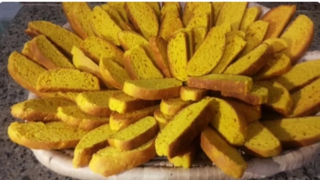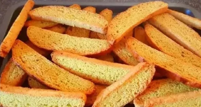 يقطع العجين إلى شرائح، ثم يوضع في الفرن حتى تمام الطهي ثم يقدم.