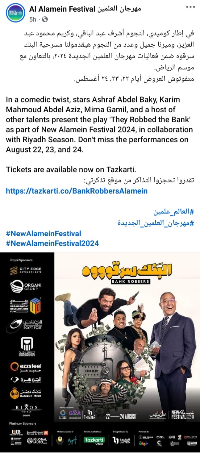 و طرحت تذاكر مسرحية البنك سرقوه فى مهرجان العلمين الجديدة بنسخته الثانية من خلال منصة "تذكرتى" الإلكترونية، لأربع فئات، وتعرض المسرحية أيام 22 و23 و24 أغسطس.