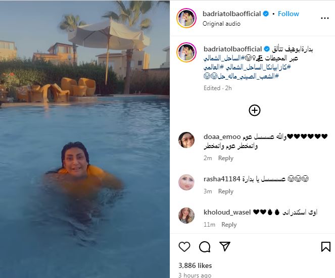نشرت بدرية طلبة مقطع الفيديو وهي تسبح عبر حسابها الرسمي على موقع الصور والفيديوهات "إنستجرام" معلقة: "بدارة أبوهيف تتألق عبر المحيطات".