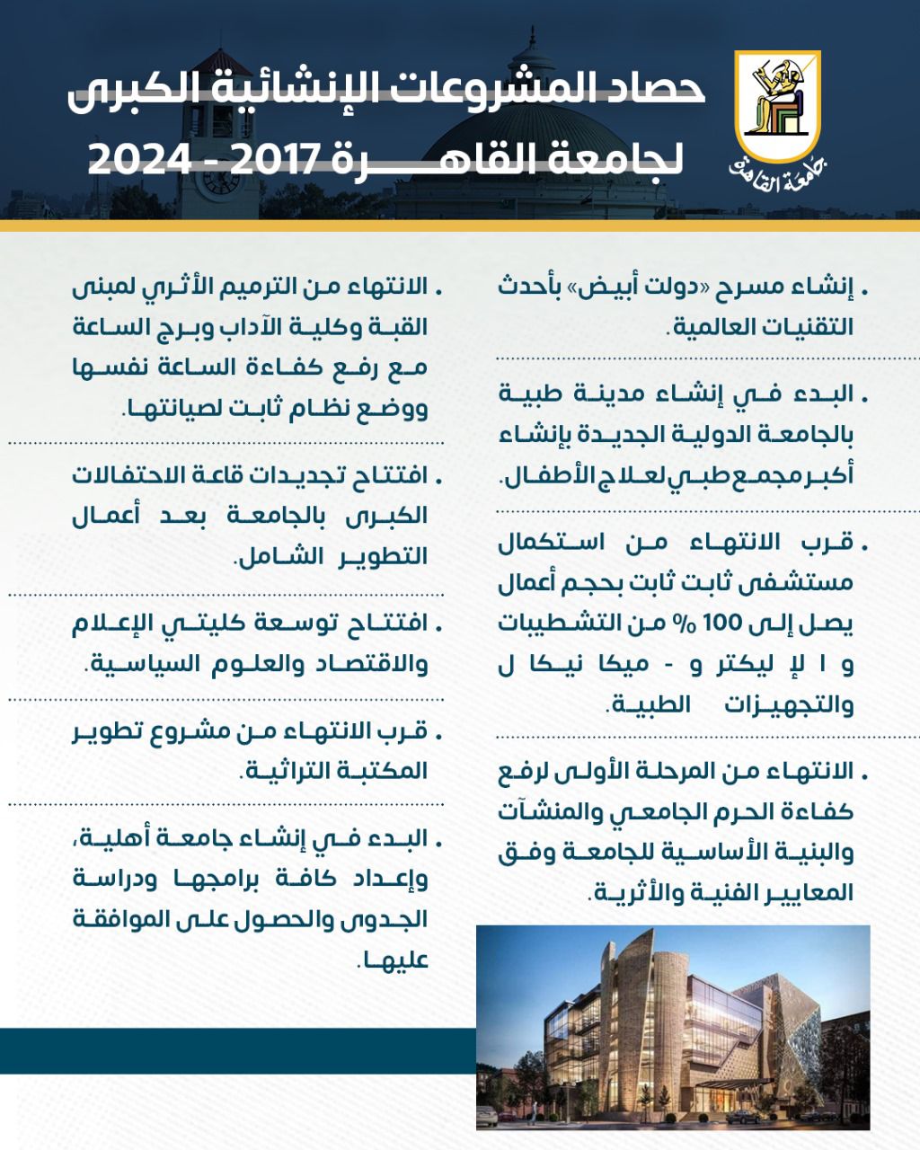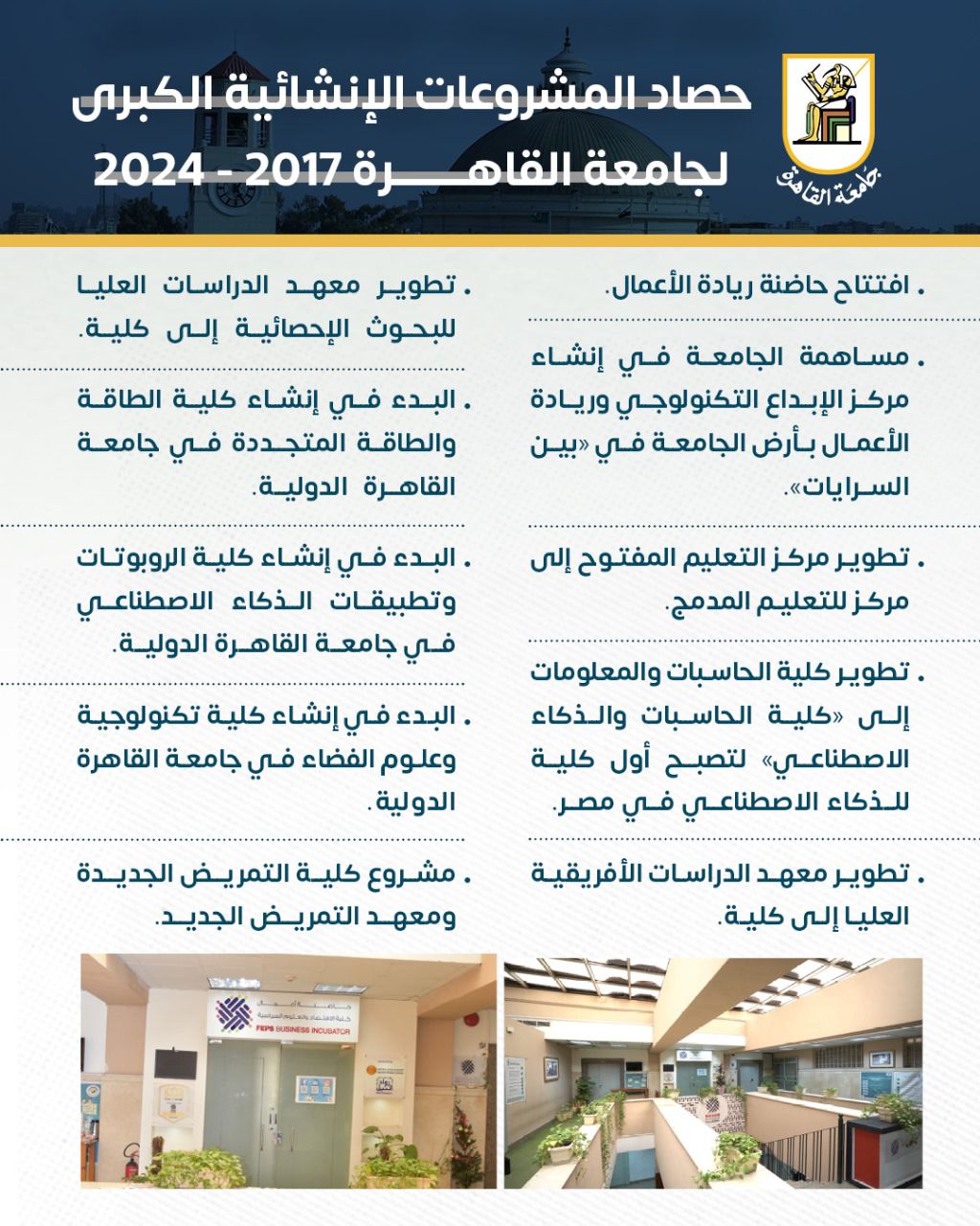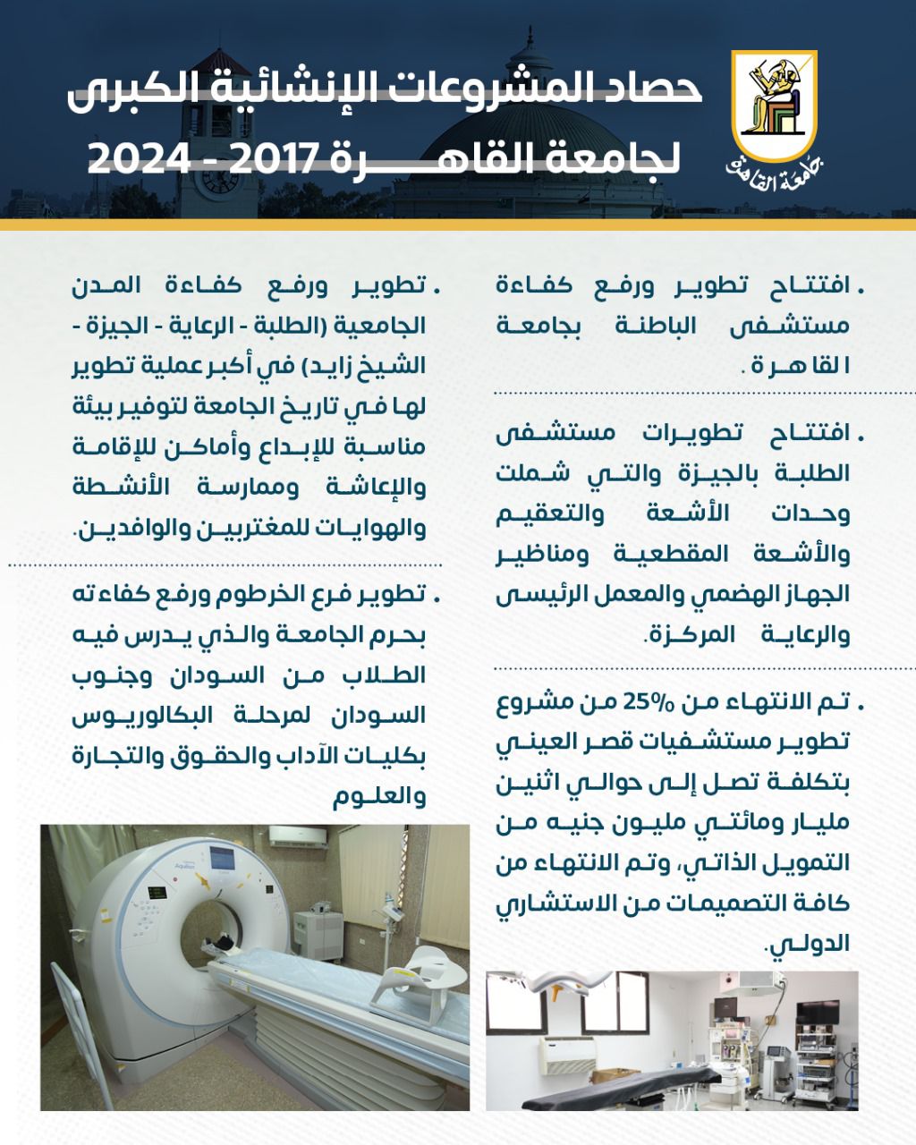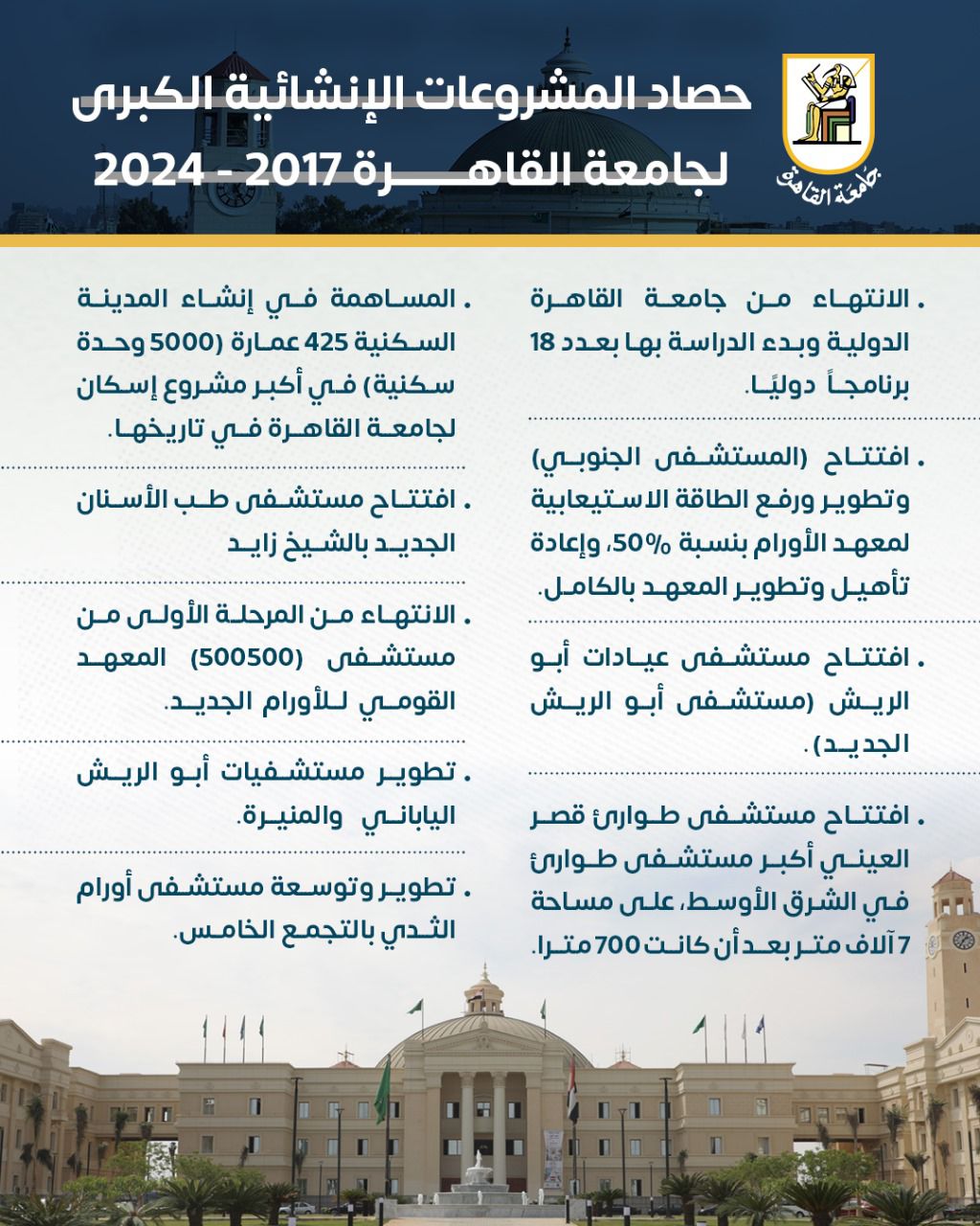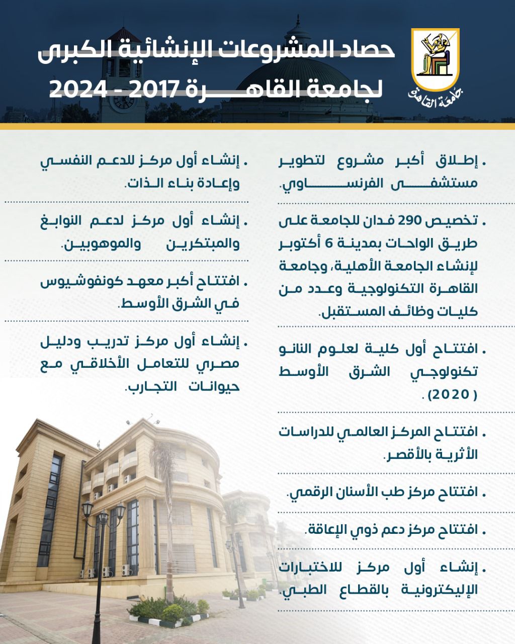 نجحت جامعة القاهرة بقيادة الدكتور محمد الخشت رئيس الجامعة في تنفيذ مجموعة من المشروعات الإنشائية الكبرى والتي حققتها الجامعة علي مدار 7 سنوات متواصلة، حيث حرصت على تنفيذها والسير فيها بخطى سريعة ووفق جدول زمني محدد، ومن أهمها إنشاء جامعة القاهرة الدولية وبدء الدراسة بها، وإنشاء مستشفيات جديدة ومشروع تطوير المستشفيات الجامعية، ومشروع إسكان أعضاء هيئة التدريس والعاملين بمدينة السادس من أكتوبر، والبدء في إنشاء جامعة القاهرة الأهلية والعديد من المُنشآت الجامعية الأخري.