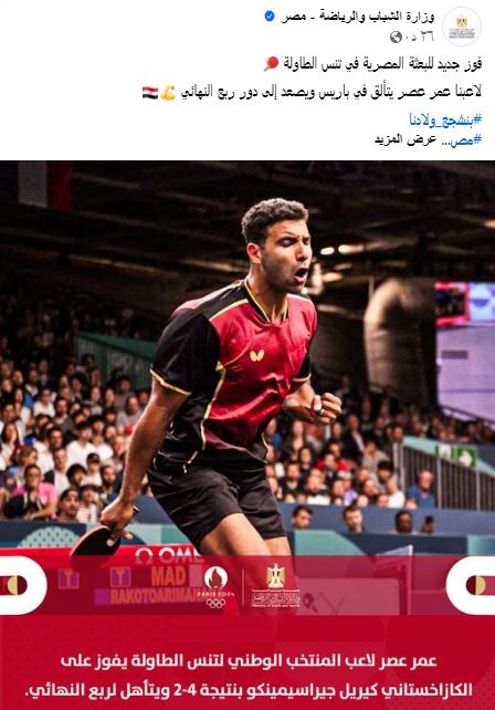 يذكر أن عمر عصر تأهل لربع نهائي أولمبياد طوكيو 2020 الماضية، محققاً إنجازًا جديدًا لتنس الطاولة المصرية.