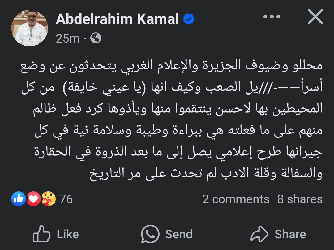كتب عبد الرحيم كمال منشور على صفحته الرسمية عبر موقع التواصل الاجتماعي "فيسبوك" وعلق قائلا: "محللو وضيوف الجزيرة والإعلام الغربي يتحدثون عن وضع إسرائيل الصعب وكيف انها (يا عيني خايفة) من كل المحيطين بها لأحسن ينتقموا منها ويأذوها كرد فعل ظالم منهم على ما فعلته هي ببراءة وطيبة وسلامة نية في كل جيرانها".