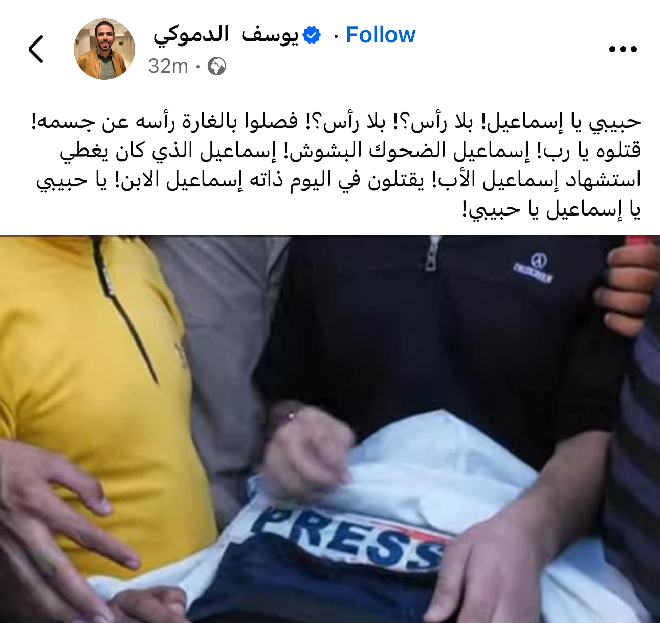 واستشهد منذ قليل ، المذيع الفلسطيني إسماعيل الغول اثناء تغطيته الإعلامية من أمام منزل إسماعيل هنية ، بعد اغتياله فى إيران.