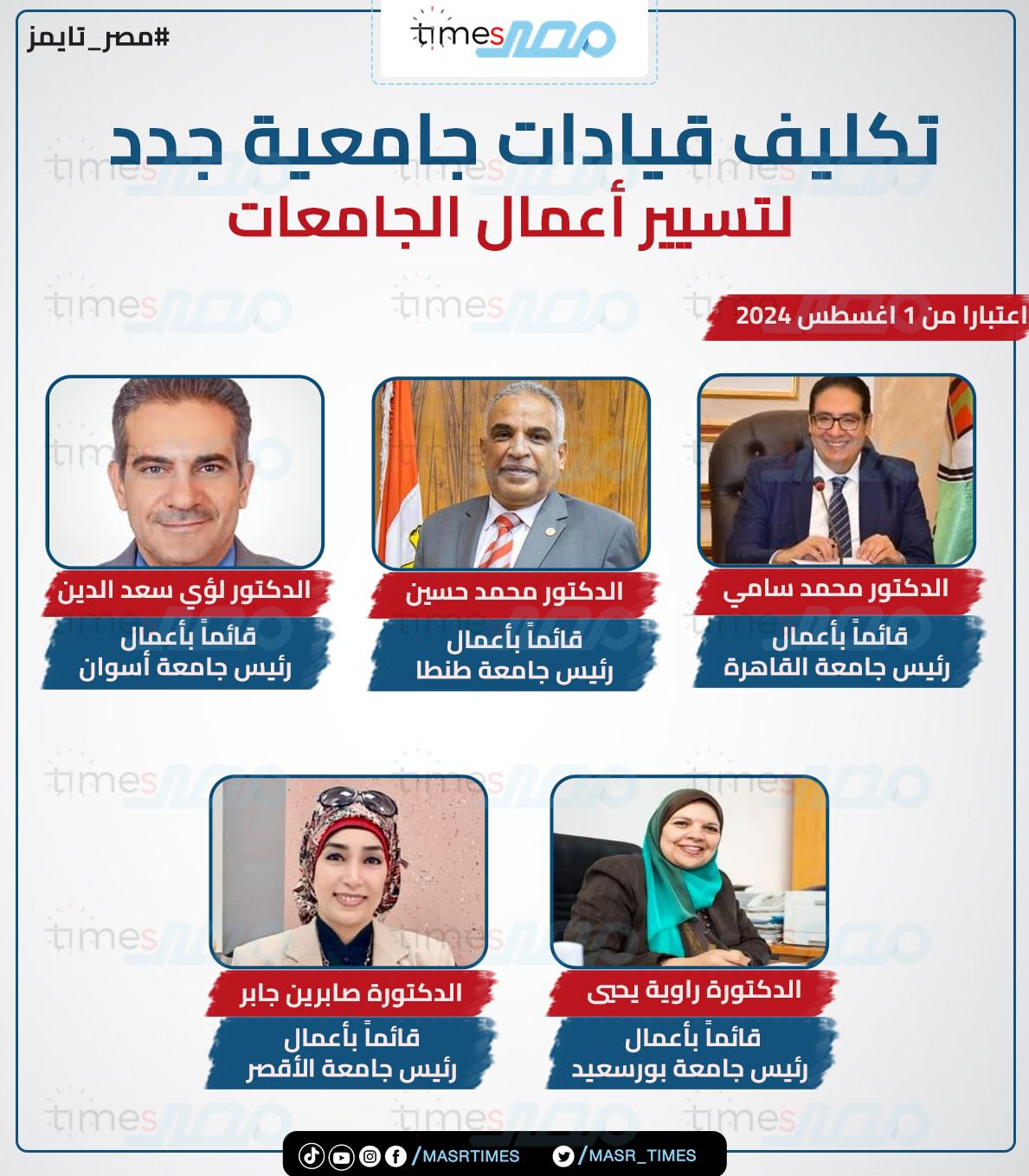 وشمل التكليف الوزاري: الدكتور محمد سامي عبدالصادق نائب رئيس جامعة القاهرة لشئون خدمة المجتمع وتنمية البيئة، قائمًا بعمل رئيس جامعة القاهرة، والدكتور محمد حسين محمود نائب رئيس جامعة طنطا لشئون التعليم والطلاب قائمًا بعمل رئيس جامعة طنطا، والدكتورة راوية يحيى محمود رزق نائب رئيس جامعة بورسعيد لشئون الدراسات العليا والبحوث قائما بعمل رئيس جامعة بورسعيد.