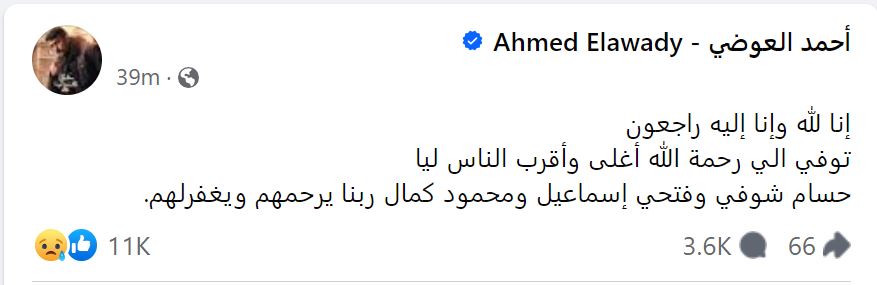 أحمد العوضي ينعي المنتجين الثلاثة: أغلى وأقرب الناس ليا ربنا يرحمهم ويغفرلهم