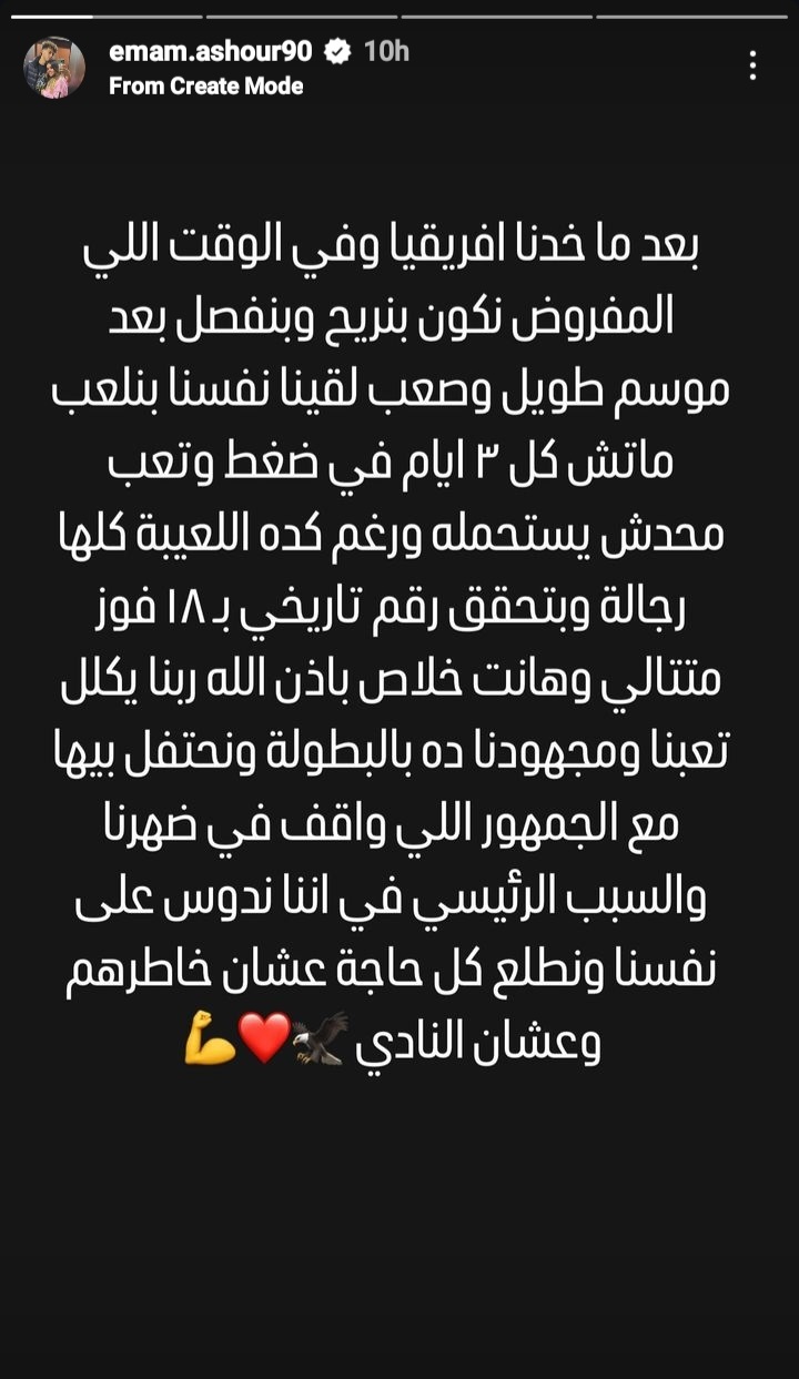وجة لاعب النادي الأهلي إمام عاشور رسالة لجمهور الأهلي وعلق علي مباريات الأهلي الأخيرة حيث كتب عبر صفحته إنستجرام " بعد ما خدنا افريقيا وفي الوقت اللي المفروض نكون بنريح وبنفصل بعد موسم طويل وصعب لقينا نفسنا بنلعب ماتش كل ٣ أيام في ضغط وتعب محدش يستحمله ورغم كده اللعيبة كلها رجالة وبتحقق رقم تاريخي بـ ۱۸ فوز متتالي وهانت خلاص باذن الله ربنا يكلل تعبنا ومجهودنا ده بالبطولة ونحتفل بيها مع الجمهور اللي واقف في ضهرنا والسبب الرئيسي في اننا ندوس على نفسنا ونطلع كل حاجة عشان خاطرهم وعشان النادي .