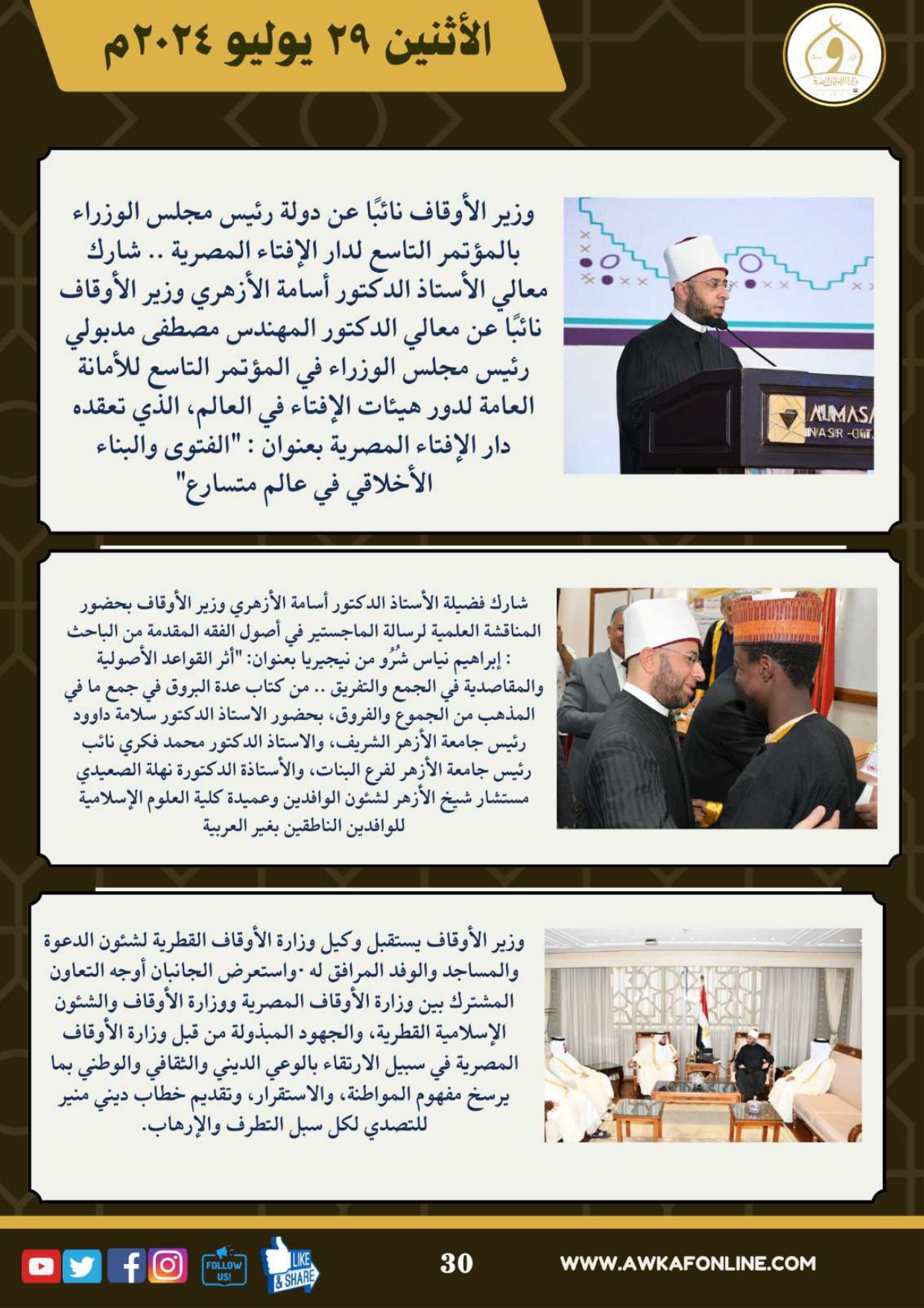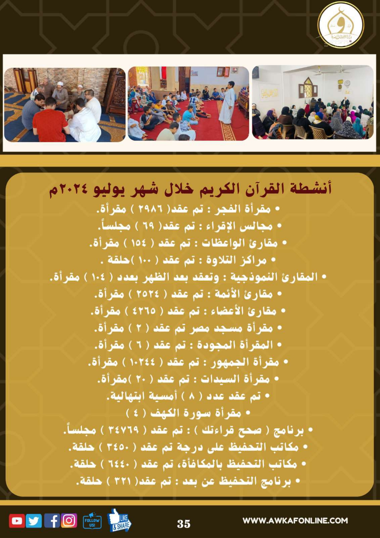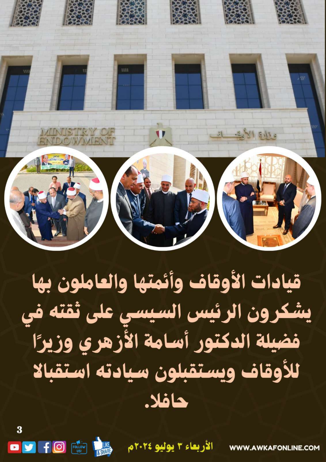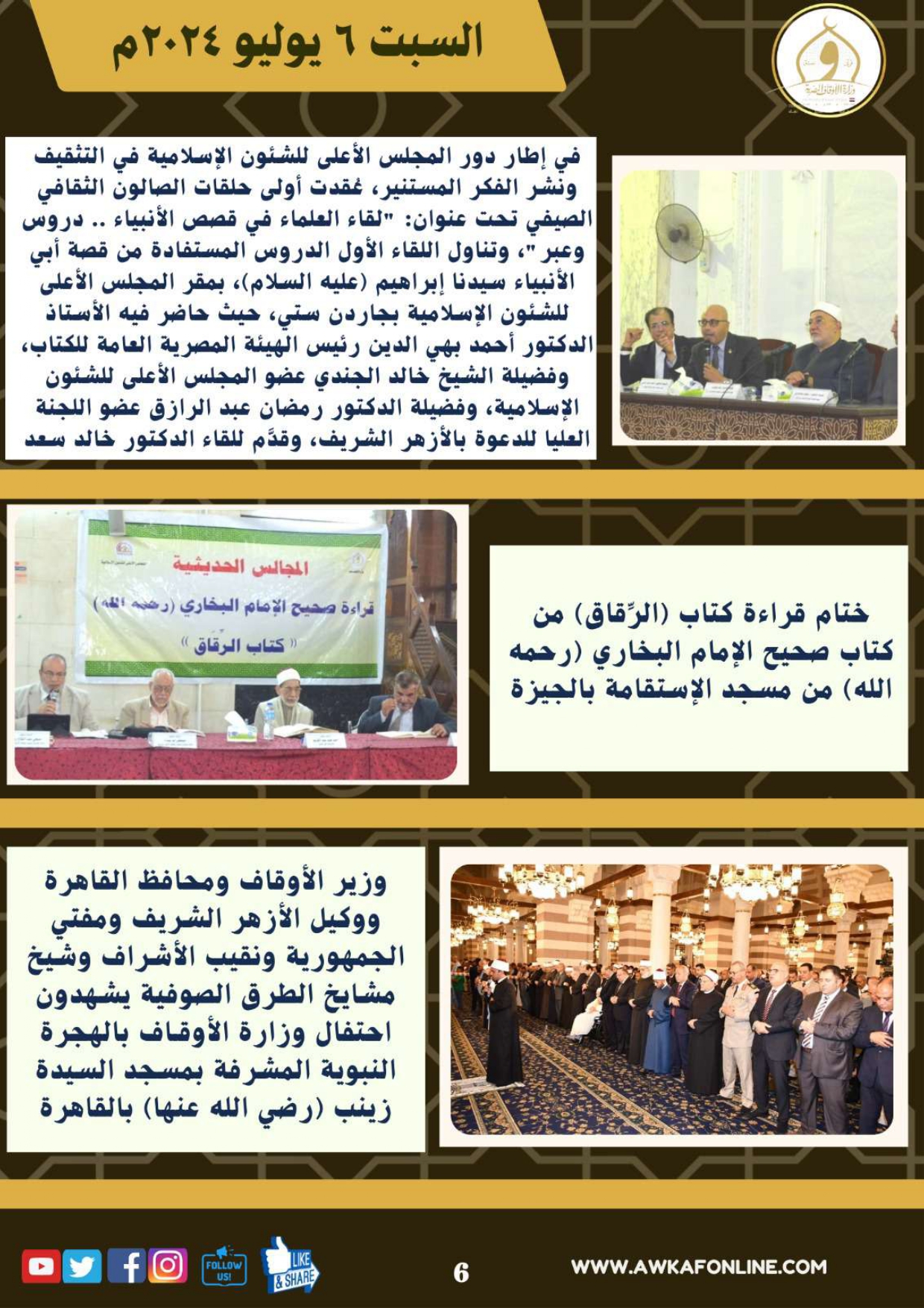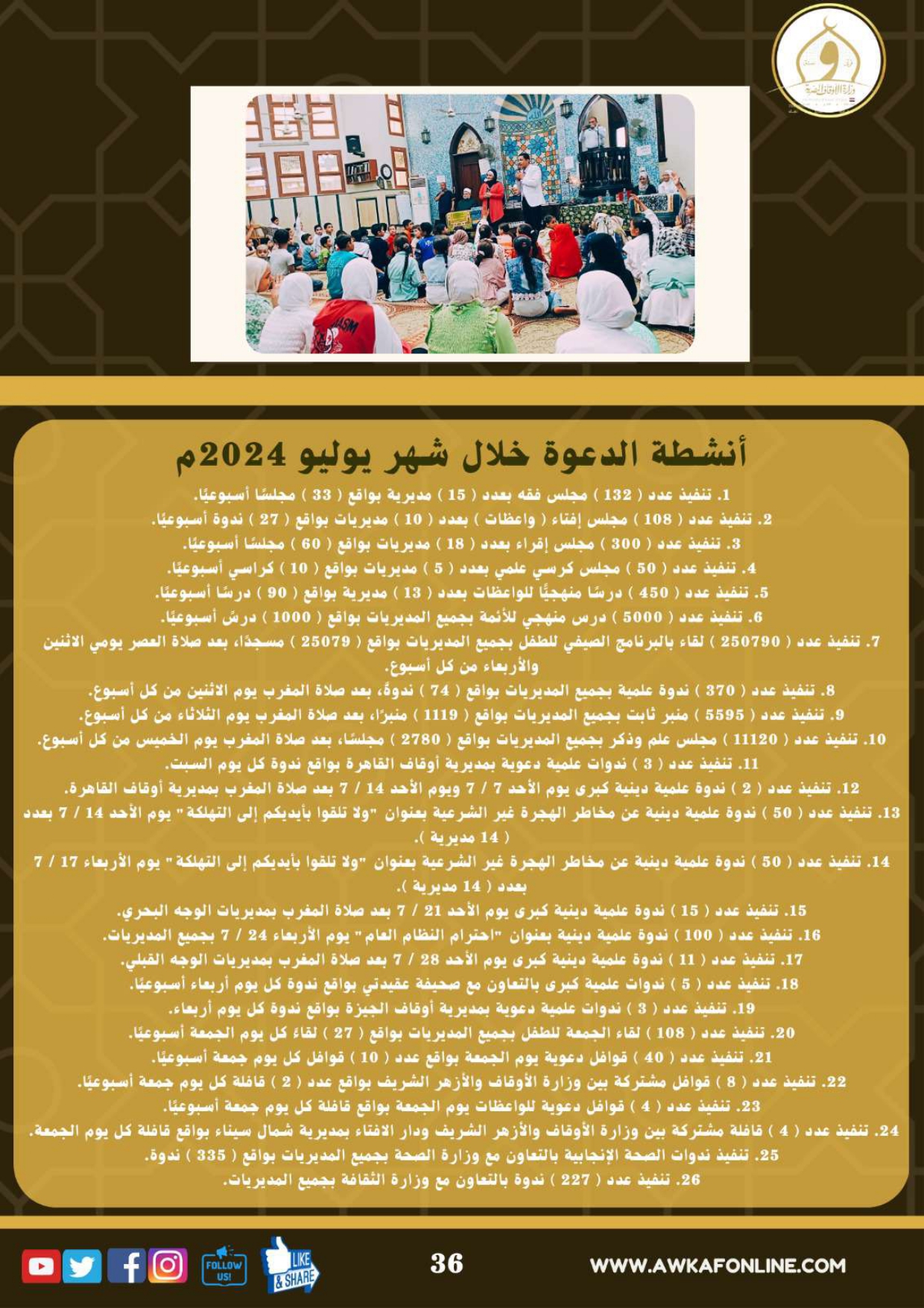 ننشر الحصاد الشهري لرصد أنشطة وزارة الأوقاف في الفترة من 3 حتى 31 يوليو 2024م