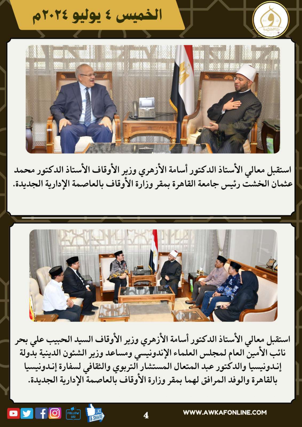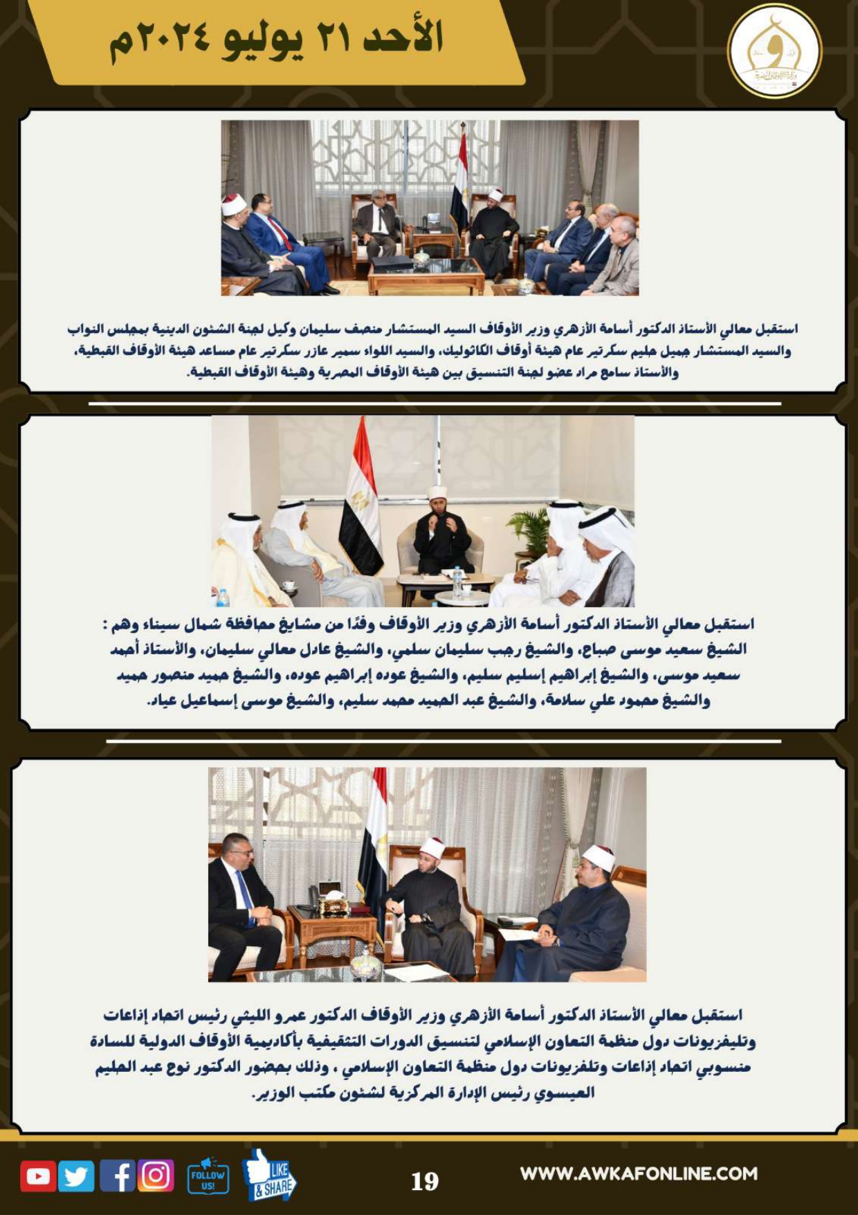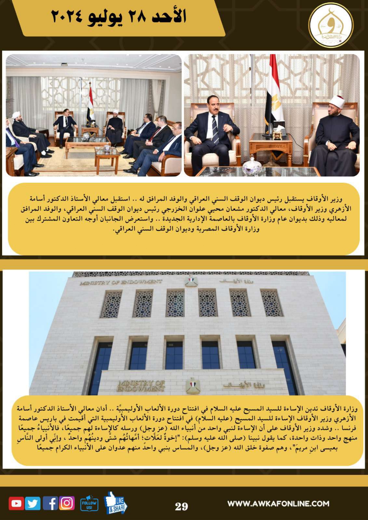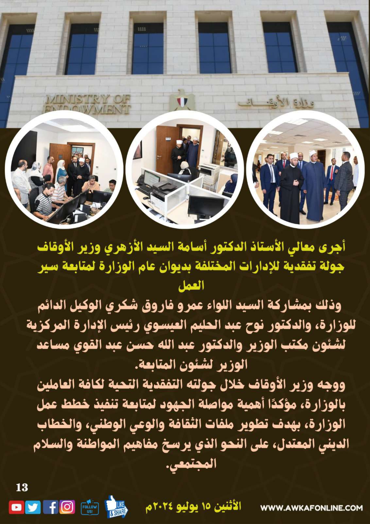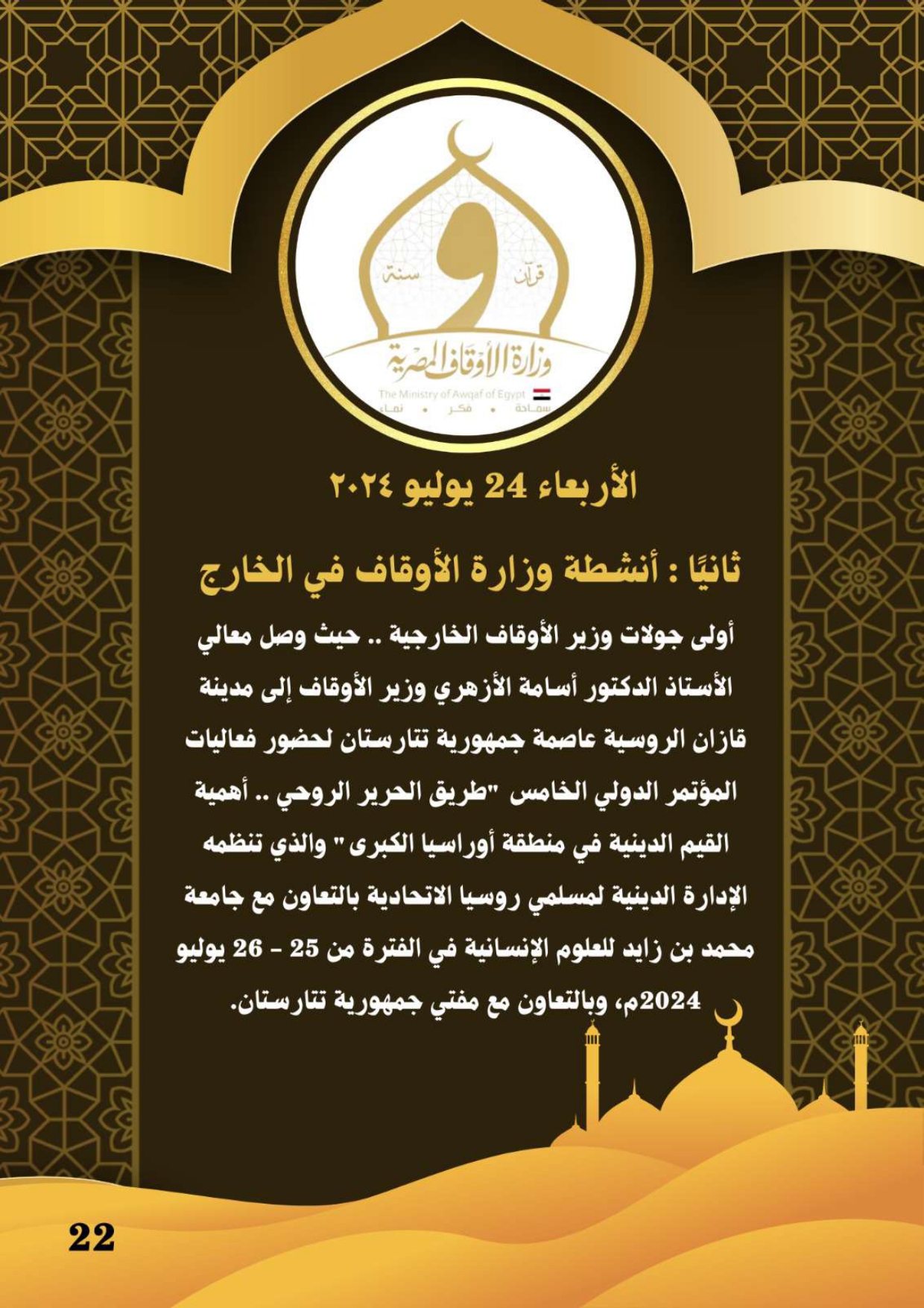 ننشر الحصاد الشهري لرصد أنشطة وزارة الأوقاف في الفترة من 3 حتى 31 يوليو 2024م