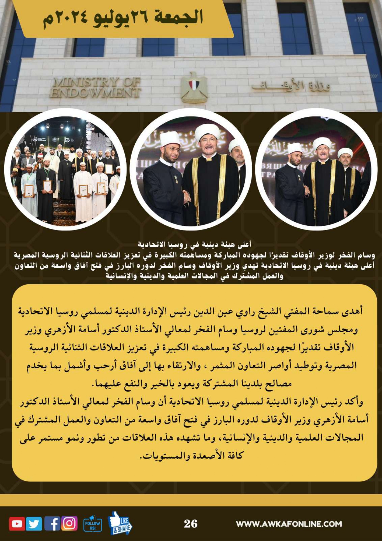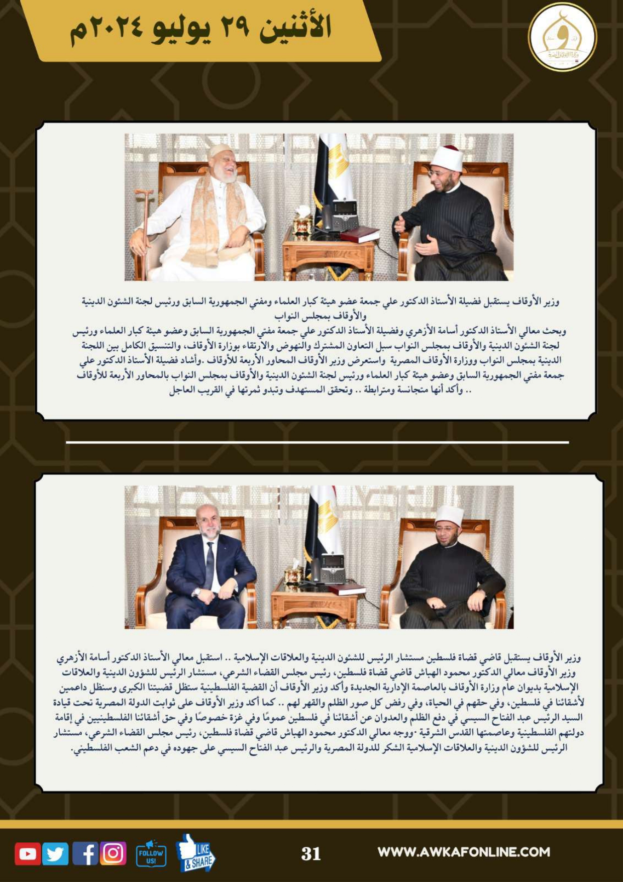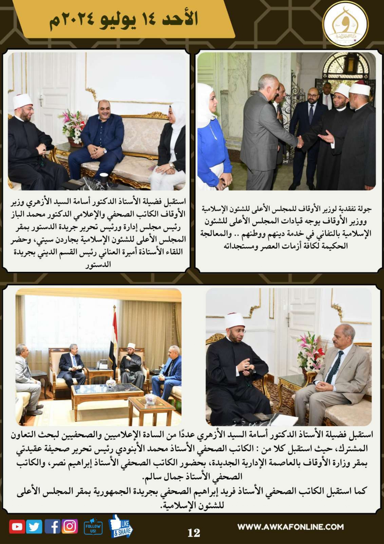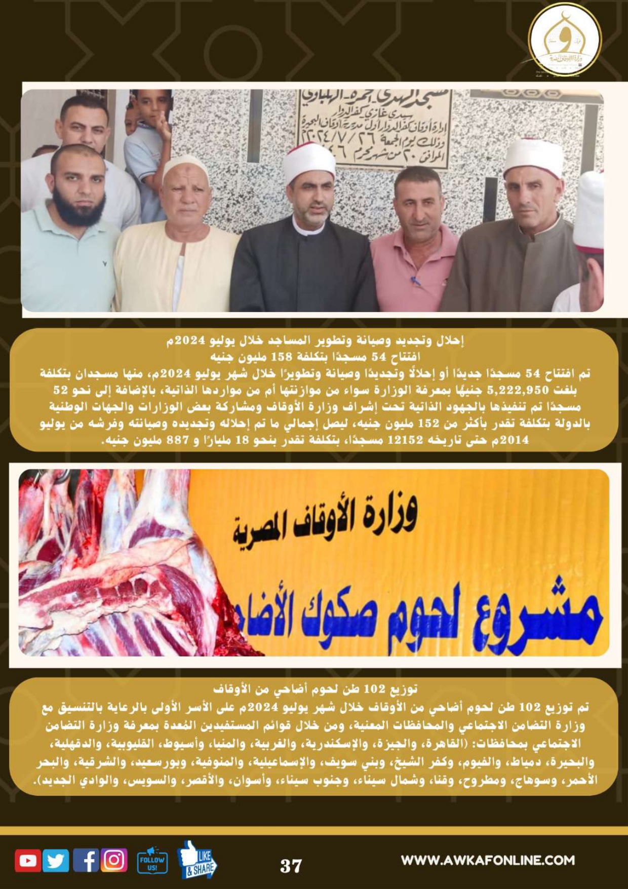 ننشر الحصاد الشهري لرصد أنشطة وزارة الأوقاف في الفترة من 3 حتى 31 يوليو 2024م