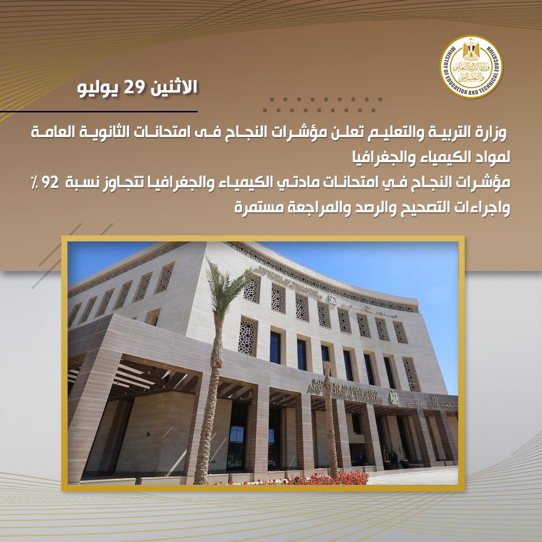 وأوضحت الوزارة أن نسبة النجاح في امتحاني مادتي الكيمياء والجغرافيا تجاوزت ٩٢٪، حيث لا تزال اجراءات التصحيح ورصد الدرجات والمراجعة مستمرة.
