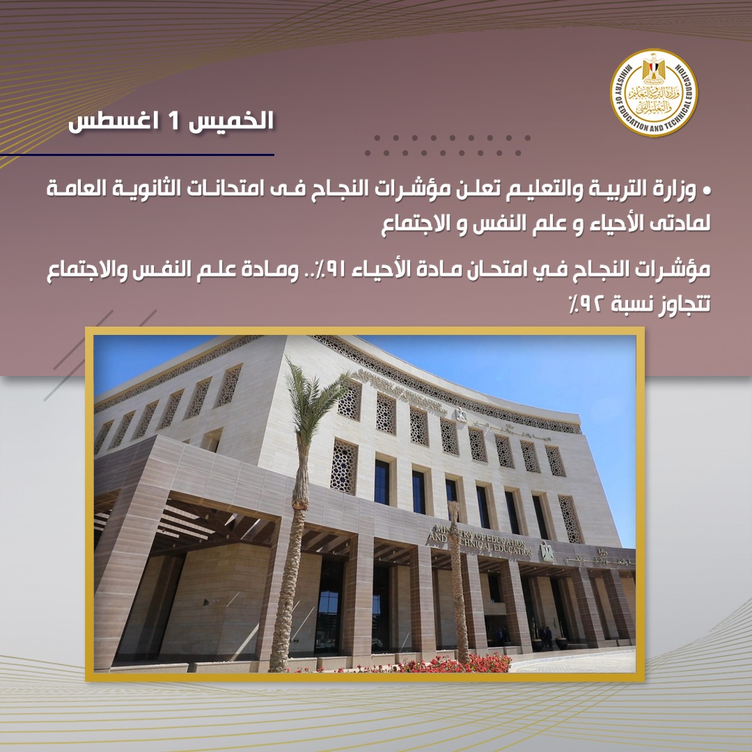 وأوضحت الوزارة أن نسبة النجاح في امتحان مادة الأحياء بلغت ٩١٪، في حين تخطت مؤشرات النجاح في مادة علم النفس والاجتماع نسبة ٩٢٪.