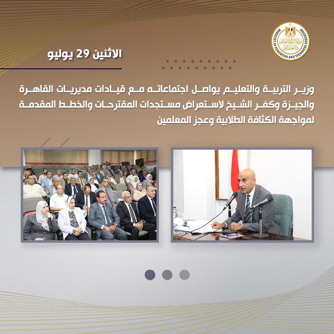 واصل محمد عبد اللطيف وزير التربية والتعليم والتعليم الفنى، اجتماعاته الدورية مع قيادات التربية والتعليم بمديريات القاهرة والجيزة وكفر الشيخ في إطار المتابعة المستمرة لمختلف الآليات والحلول والمقترحات التي يمكن تنفيذها لمواجهة الكثافات الطلابية وعجز المعلمين مع بداية العام الدراسي الجديد ٢٠٢٤ / ٢٠٢٥.