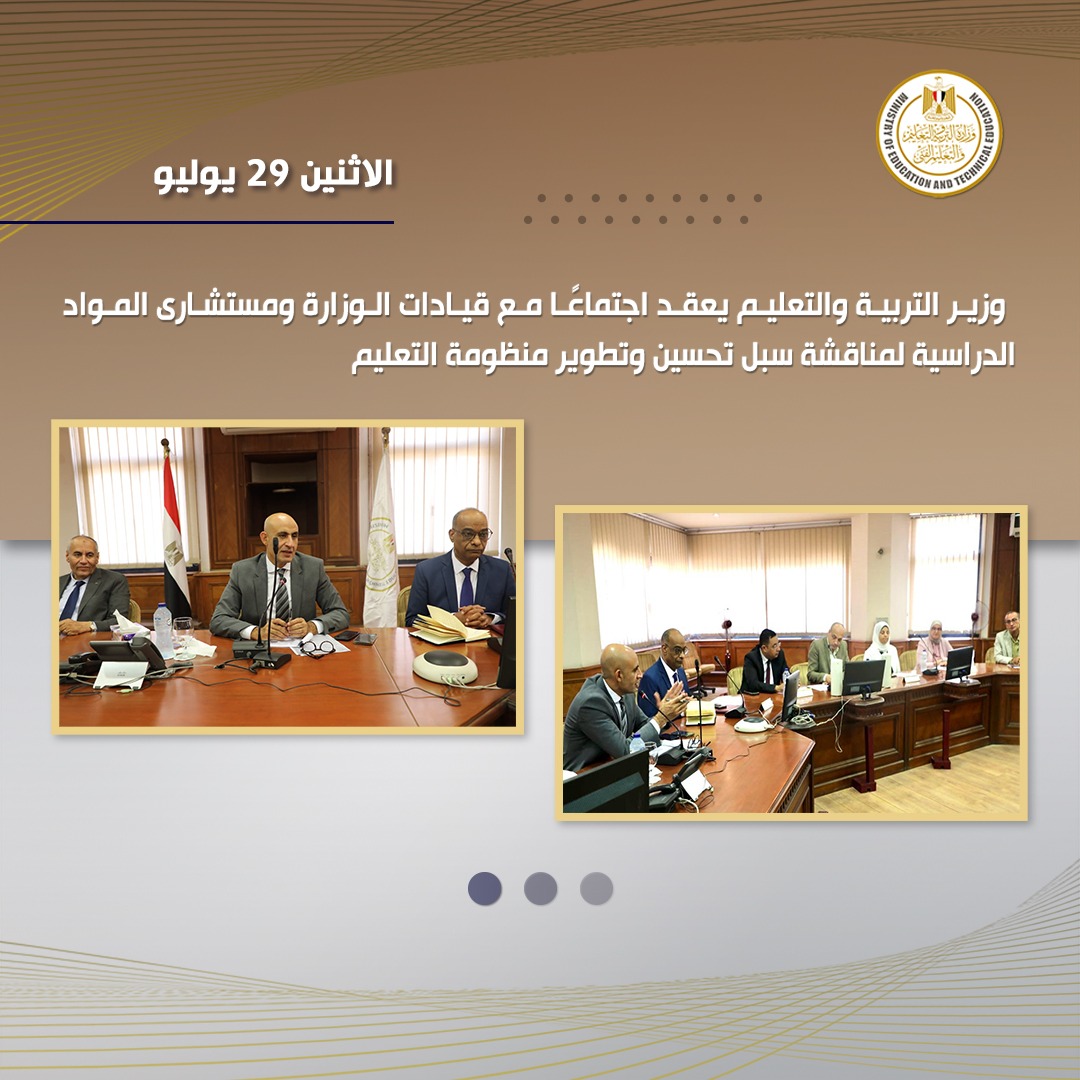 عقد محمد عبد اللطيف وزير التربية والتعليم والتعليم الفنى، اجتماعًا مع عدد من قيادات الوزارة ومستشارى تنمية المواد الدراسية، وموجهى المواد الدراسية؛ لمناقشة سبل تحسين وتطوير منظومة التعليم.