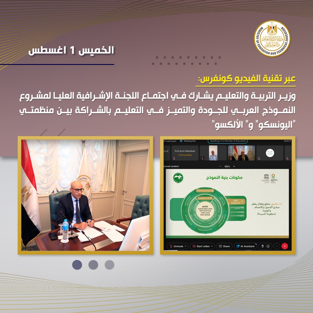 شارك محمد عبد اللطيف وزير التربية والتعليم والتعليم الفني، عبر تقنية الفيديو كونفرنس، في اجتماع اللجنة الإشرافية العليا لمشروع النموذج العربي للجودة والتميز في التعليم بالشراكة بين منظمتي “اليونسكو” والألكسو”؛ وذلك لمناقشة المشروع الذي يمثل التزامًا باحتياجات وتطلعات نظم التعليم في الدول العربية لتعزيز التنافسية ومخرجاتها على الصعيد العالمي، والإسهام في تحقيق مؤشرات الهدف الرابع من خطة التنمية المستدامة لعام ٢٠٣٠ (ضمان التعليم الجيد المنصف والشامل للجميع وتعزيز فرص التعلم مدى الحياة للجميع).