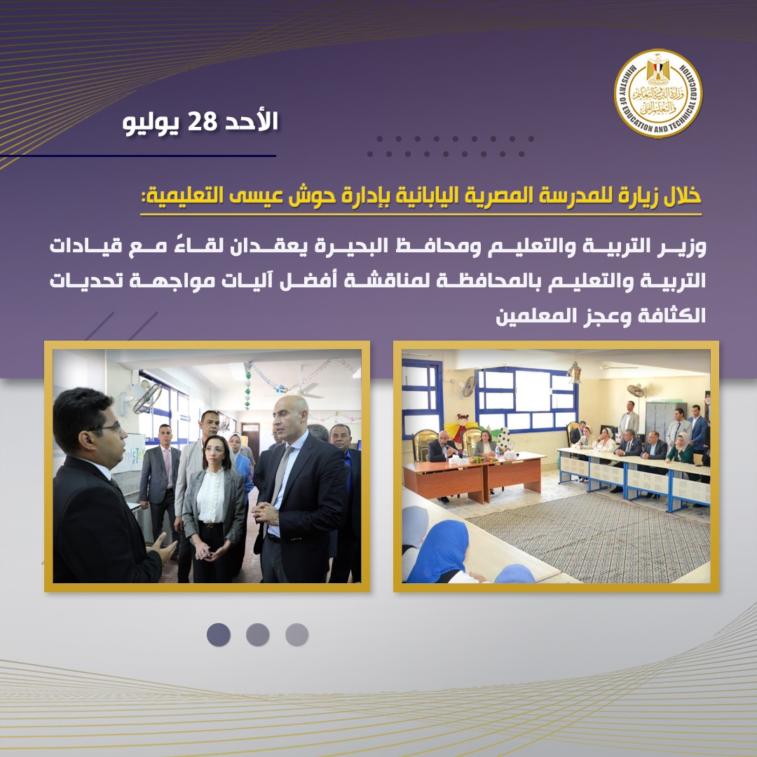 عقد محمد عبد اللطيف وزير التربية والتعليم والتعليم الفنى والدكتورة جاكلين عازر محافظ البحيرة، لقاءً مع عدد من ومديرى ووكلاء الإدارات التعليمية، ومديري المدارس بمحافظة البحيرة؛ وذلك بالمدرسة المصرية اليابانية بإدارة حوش عيسى التعليمية، حيث تناول اللقاء مناقشة آليات مواجهة تحديات الكثافة الطلابية وعجز المعلمين بالمحافظة.