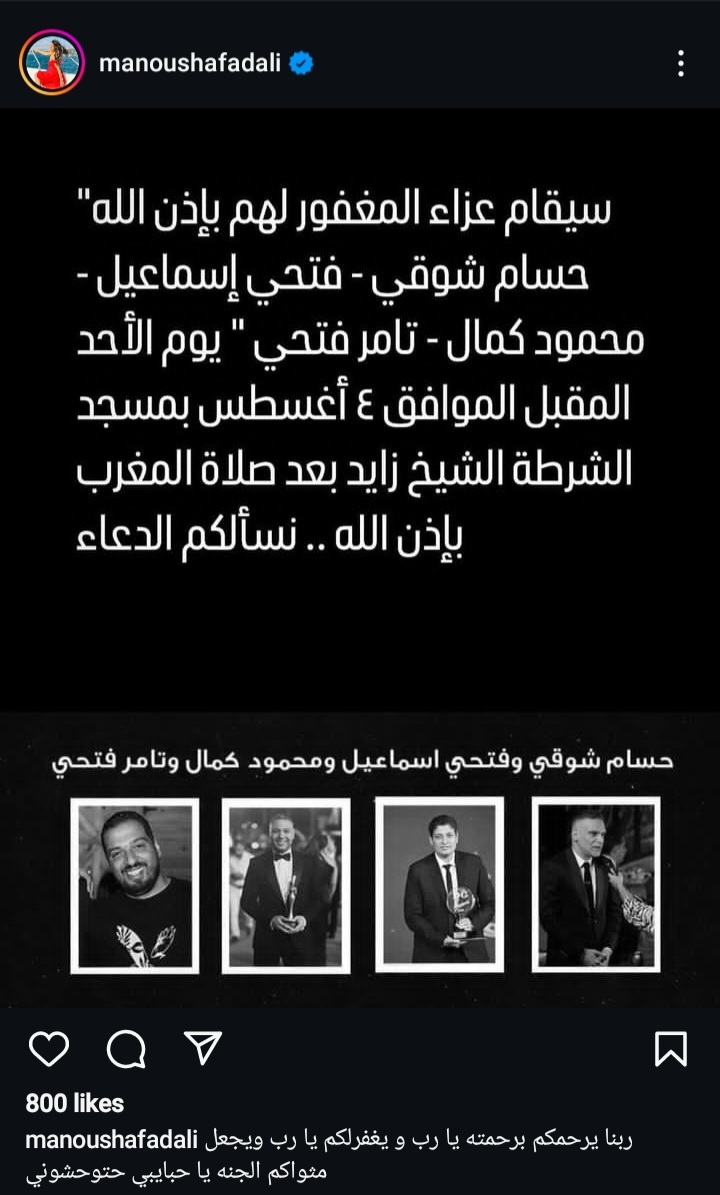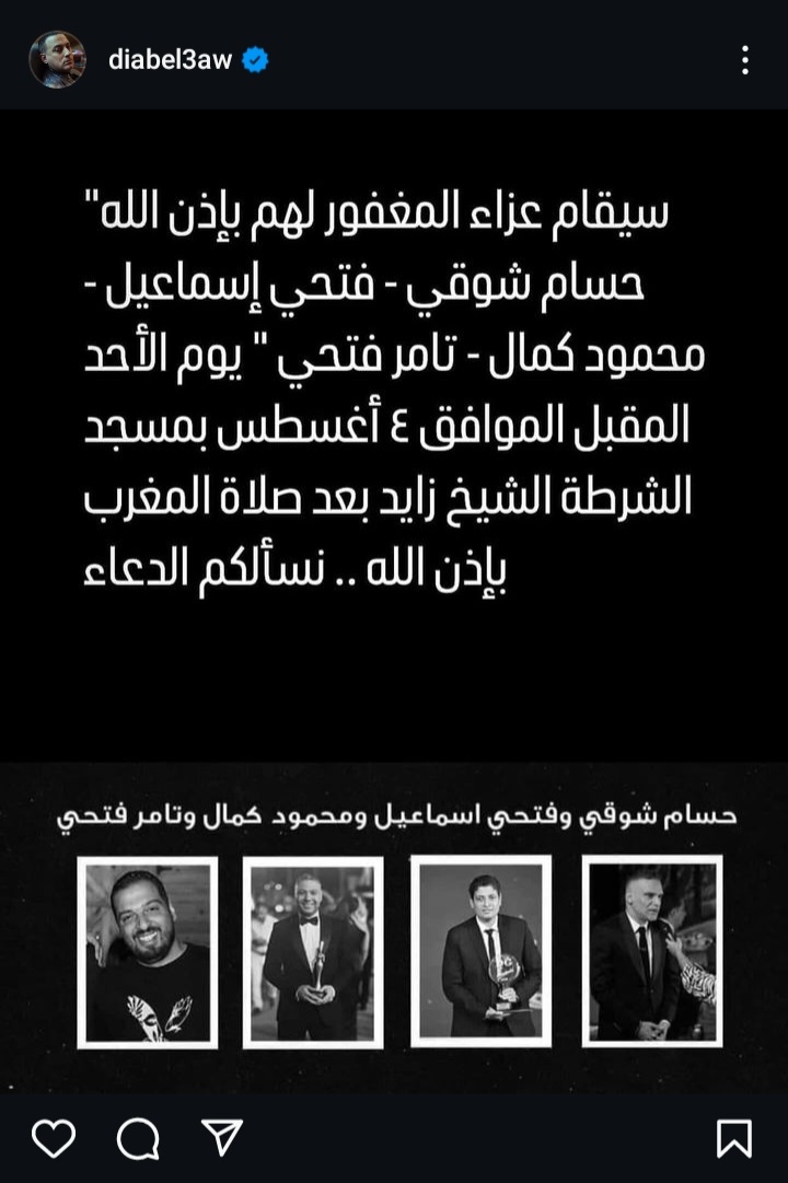 يقام عزاء المنتجين الراحلين، حسام شوقي المشرف العام على الإنتاج فى شركة سينرجى، والمنتج الفنى فتحي إسماعيل، والمنتج الفني محمود كمال، والمنتج الفني تامر فتحي بعد غد الأحد الموافق 4 أغسطس بمسجد الشرطة الشيخ زايد بعد صلاة المغرب.