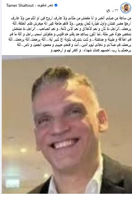 ونشر شلتوت صورة المنتج حسام شوقي ونعاه بكلمات مؤثرة " من ساعة من وصلني الخبر و انا مقمتش من مكاني ولا عارف اروح فين او اكلم مين ولا عارف ارجع مصر عشان وأول طيارة كمان يومين ..ولا فاهم حاجة غير انة متعزش علي الخلقة..اللة يرحمك...الراجل دة كان و نعم الأخلاق و نعم الابن لأمه...و نعم الصاحب... الراجل ده مشفتش شخص جواه خير مثلة...لما اكون بساعد حد يقلي خد فلوس و متقولش اسمي..راجل و الله ما في في أخلاقه وطيبته و جدعنة....و كنت يتشرف بكونه اخ كببر ليا....اللة يرحمك..اللة يرحمك...الله يرحمك..في صلاتي ودعائي ليوم الدين...أتت و فتحي حبيبي و محمود الجميل و تامر...اللة يرحمكم..يا رب..احسبهم عندك شهداء.. و اغفر لهم وارحمهم ".