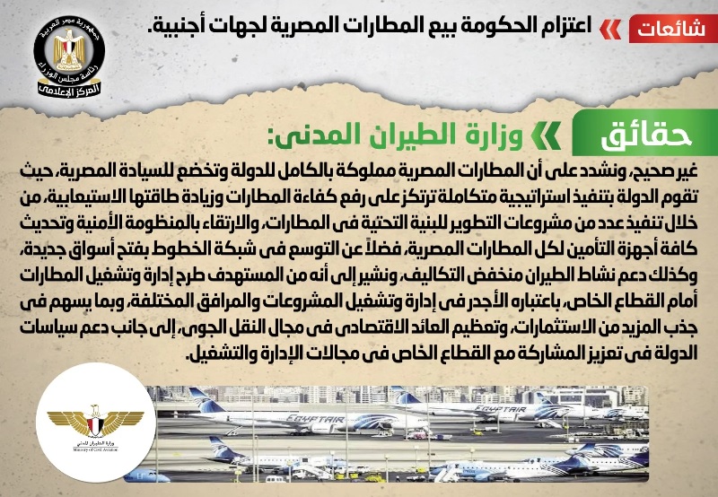 كشف المركز الاعلامى لمجلس الوزراء إنه فى ضوء ما تردد من أنباء بشأن اعتزام الحكومة بيع المطارات المصرية لجهات أجنبية، وقد تواصل المركز مع وزارة الطيران المدني، والتي نفت تلك الأنباء، مُؤكدةً أنه لا صحة لاعتزام الحكومة بيع المطارات المصرية لجهات أجنبية، مُشددةً على أن المطارات المصرية مملوكة بالكامل للدولة وتخضع للسيادة المصرية، حيث تقوم الدولة بتنفيذ استراتيجية متكاملة ترتكز على رفع كفاءة المطارات وزيادة طاقتها الاستيعابية، من خلال تنفيذ عدد من مشروعات التطوير للبنية التحتية في المطارات، والارتقاء بالمنظومة الأمنية وتحديث كافة أجهزة التأمين لكل المطارات المصرية، فضلاً عن التوسع في شبكة الخطوط بفتح أسواق جديدة، وكذلك دعم نشاط الطيران منخفض التكاليف، مُشيرةً إلى أنه من المستهدف طرح إدارة وتشغيل المطارات أمام القطاع الخاص، باعتباره الأجدر في إدارة وتشغيل المشروعات والمرافق المختلفة، وبما يسهم في جذب المزيد من الاستثمارات، وتعظيم العائد الاقتصادي في مجال النقل الجوي، إلى جانب دعم سياسات الدولة في تعزيز المشاركة مع القطاع الخاص في مجالات الإدارة والتشغيل.
