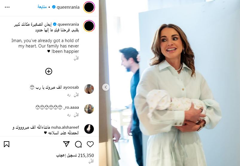 نشرت الملكة رانيا قرينة العاهل الأردني الملك عبد الله الثاني صورآ جديدة عبر صفحتها الرسمية "إنستجرام" وعبرت عن فرحتها الشديدة بقدوم إيمان بنت الحسين بن عبد الله الثاني ، وكتبت على الصور" إيمان الصغيرة مكانك كبير بقلبي. فرحتنا فيكِ ما إلها حدود"