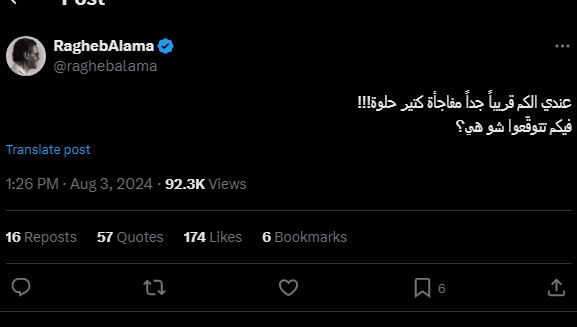 وكتب راغب علامة في تدوينة له عبر حسابه على موقع التدوينات القصيرة X: لا عندي لكم قريبًا جدًا مفاجأة كتير حلوة!!! فيكم تتوقّعوا شو هي؟.