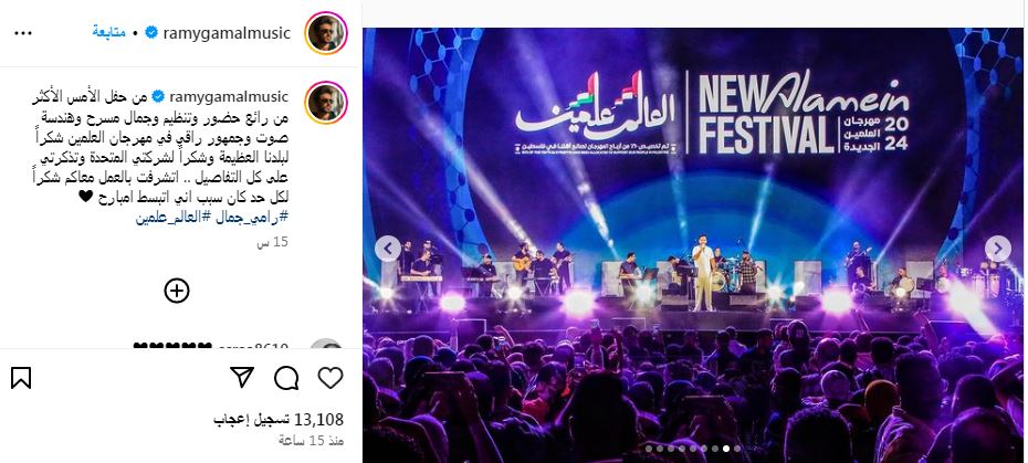 ونشر رامي جمال صورًا من الحفل، معلقًا " من حفل الأمس الأكثر من رائع حضور وتنظيم وجمال مسرح وهندسة صوت وجمهور راقي في مهرجان العلمين شكراً لبلدنا العظيمة وشكراً لشركتي المتحدة وتذكرتي على كل التفاصيل .. تشرفت بالعمل معاكم شكراً لكل حد كان سبب اني انبسط امبارح".