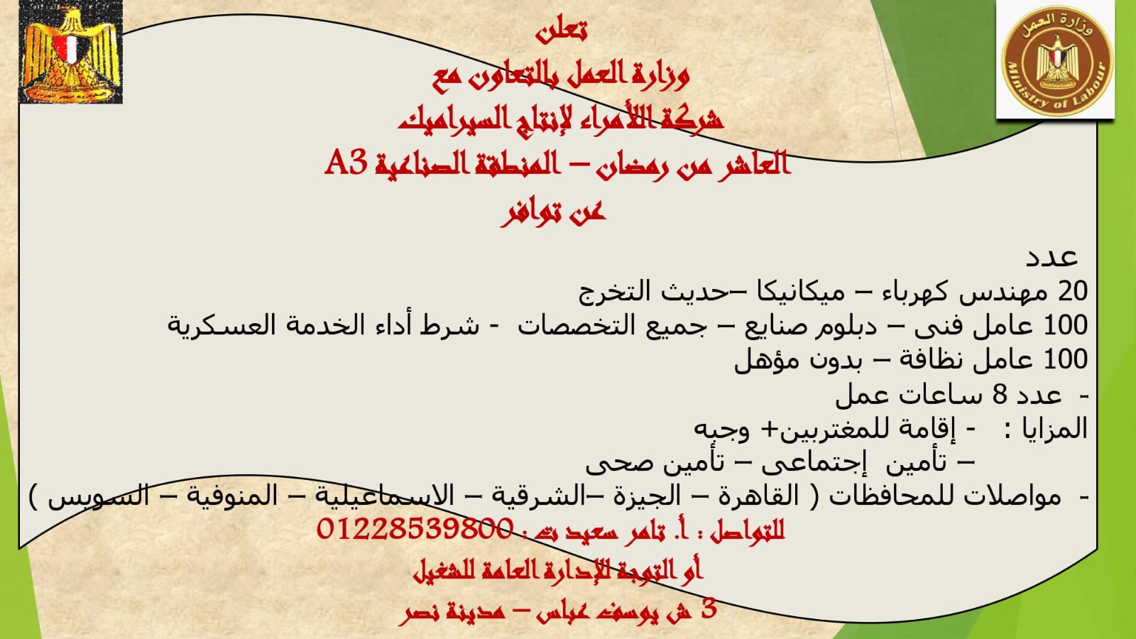 أعلن محمد جبران، وزير العمل، اليوم الأحد، عن فرص عمل جديدة، في شركة "الأمراء لإنتاج السيراميك" بالمنطقة الصناعية بمدينة العاشر من رمضان..