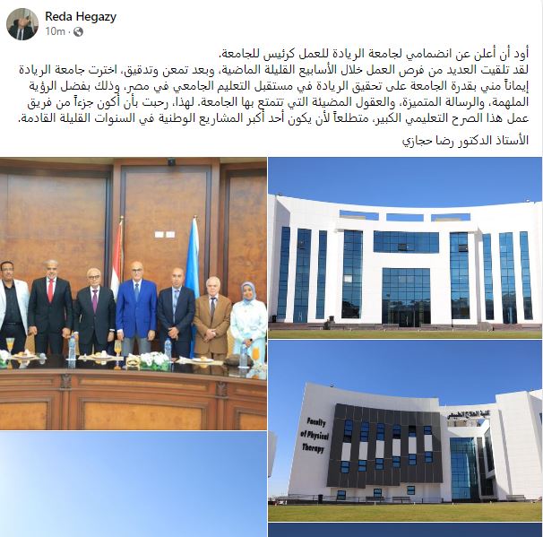 وقال الدكتور رضا حجازي عبر صفحته الرسمية على موقع التواصل الاجتماعي “فيسبوك”: “أود أن أعلن عن انضمامي لجامعة الريادة للعمل كرئيس للجامعة”.