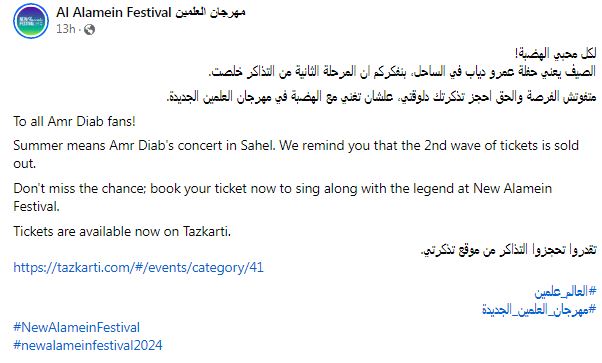 أعلن مهرجان العلمين الجديدة 2024 نفاد جميع فئات الدفعة الثانية من تذاكر حفل النجم عمرو دياب ضمن فعاليات الدورة الثانية للمهرجان، والمقرر إقامته مساء يوم الجمعة المقبل الموافق 9 أغسطس الجاري.