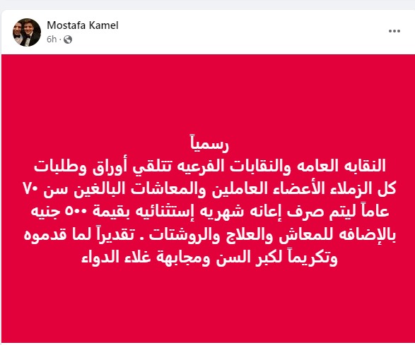 قرر الفنان مصطفى كامل نقيب المهن الموسيقية صرف إعانة شهرية استثنائية بقيمة 500 جنيه لمن تجاوز 70 عاما من أعضاء النقابة، وعلق قائلا على صفحة التواصل الاجتماعى الفيس بوك : رسميًا النقابة العامة والنقابات الفرعية تتلقي أوراق وطلبات كل الزملاء الأعضاء العاملين والمعاشات البالغين سن 70 عامًا ليتم صرف إعانة شهرية استثنائية بقيمة 500 جنيه، بالإضافة للمعاش والعلاج والروشتات تقديرًا لما قدموه وتكريمًا لكبر السن ومجابهة غلاء الدواء.