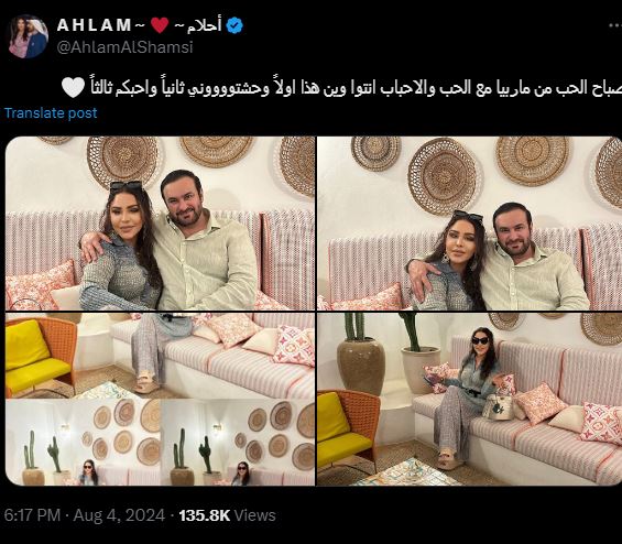 وعلقت أحلام على الصور في تدوينة لها عبر حسابها على منصة X: صباح الحب من ماربيا مع الحب والأحباب انتوا وين هذا أولًا وحشتوني ثانيًا وأحبكم ثالثًا.