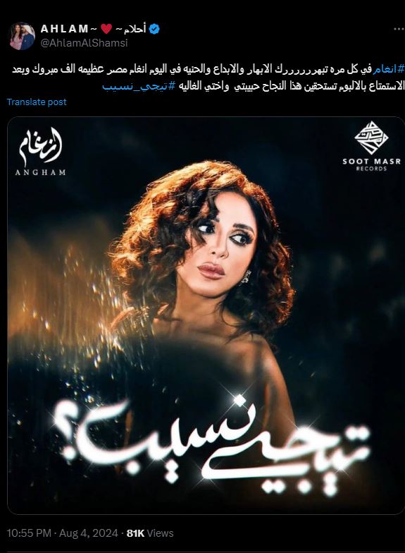 وكتبت "أحلام"عبر حسابها بمنصة "X" تويتر سابقآ: "أنغام في كل مرة تبهرك الابهار والإبداع والحنيه في اليوم انغام مصر عظيمة الف مبروك وبعد الاستمتاع بالالبوم تستحقين هذا النجاح حبيبتي واختي الغاليه، تيجي نسيب".
