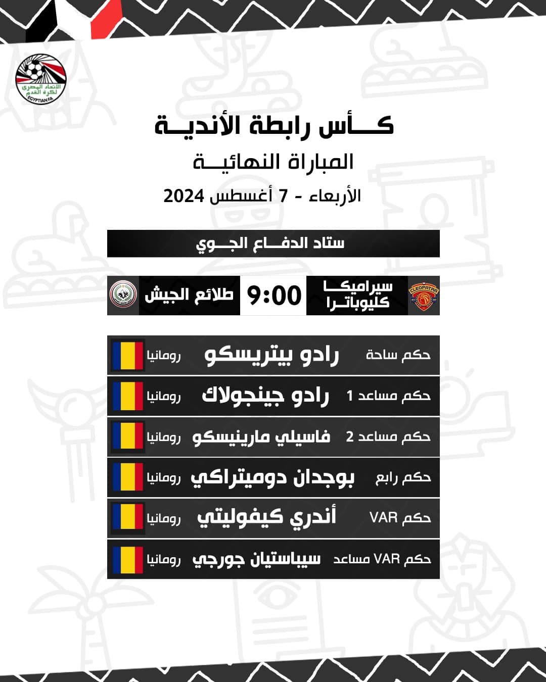 وقال الاتحاد عبر صفحته الرسمية على موقع التواصل الاجتماعي “فيسبوك”: “يدير طاقم حكام روماني بقيادة رادو بيتريسكو نهائي كأس رابطة الأندية المصرية، بين سيراميكا كليوباترا وطلائع الجيش، مساء الأربعاء المقبل”.