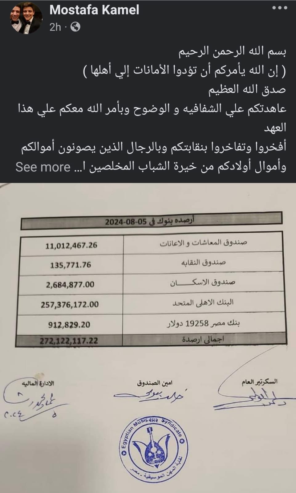 أعلن الفنان مصطفى كامل نقيب الموسيقيين عن وصول إجمالي أرصدة النقابة بالبنوك إاى 272 مليون جنيها، وذلك من خلال منشور كتبه على صفحته الرسمية عبر موقع التواصل الاجتماعي "فيسبوك".
