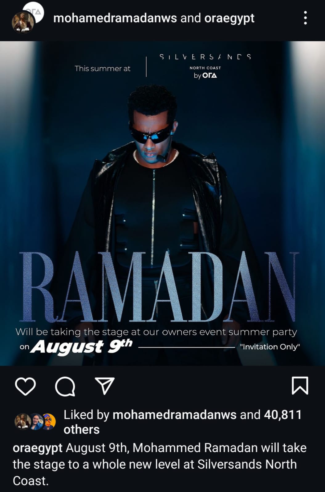 وعلقت الشركة المنظمة قائلة : "في التاسع من أغسطس، سيأخذ محمد رمضان المسرح إلى مستوى جديد تماما في سيلفر ساندز الساحل الشمالي".