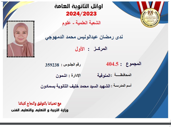 نتيجة الثانوية العامة .. حصلت الطالبة ندى رمضان عبدالونيس محمد الأولى على الثانوية العامة "علمي علوم" على مجموع 4.4.5، وتعد من أبناء محافظة المنوفية.