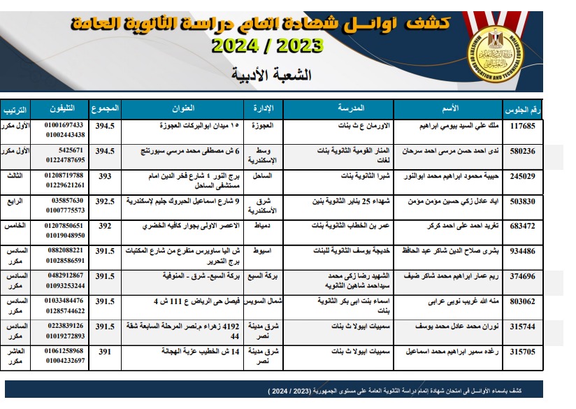 نتيجة الثانوية العامة .. أعلنت وزارة التربية والتعليم والتعليم الفني عن أسماء أوائل الثانوية العامة 2024 للعام الدراسي 2023/2024، وحصل الأول على الثانوية العامة شعبة علمي علوم على نسبة 96.8 %.