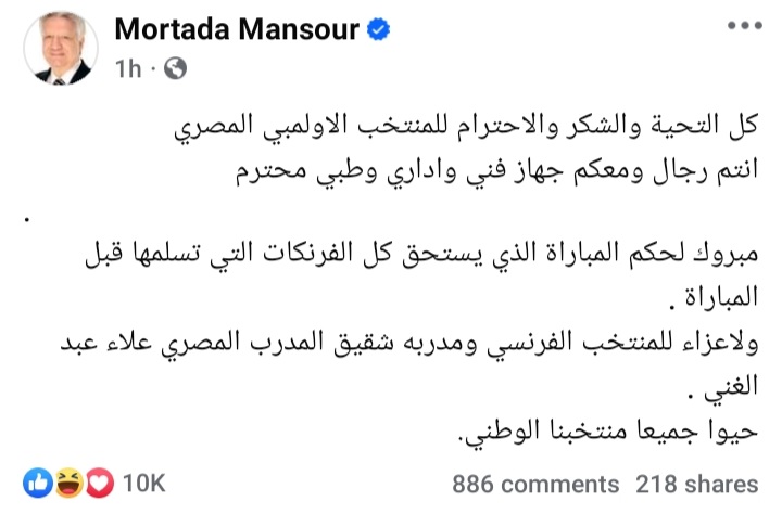 وجة مرتضي منصور عضو مجلس إدارة نادي الزمالك السابق رسالة للمنتخب الأولمبي بعد هزيمته من فرنسا بنصف نهائي أولمبياد، باريس وعلق قائلآ " كل التحية والشكر، والاحترام للمنتخب الاولمبي المصري،انتم رجال ومعكم جهاز فني واداري وطبي محترم.