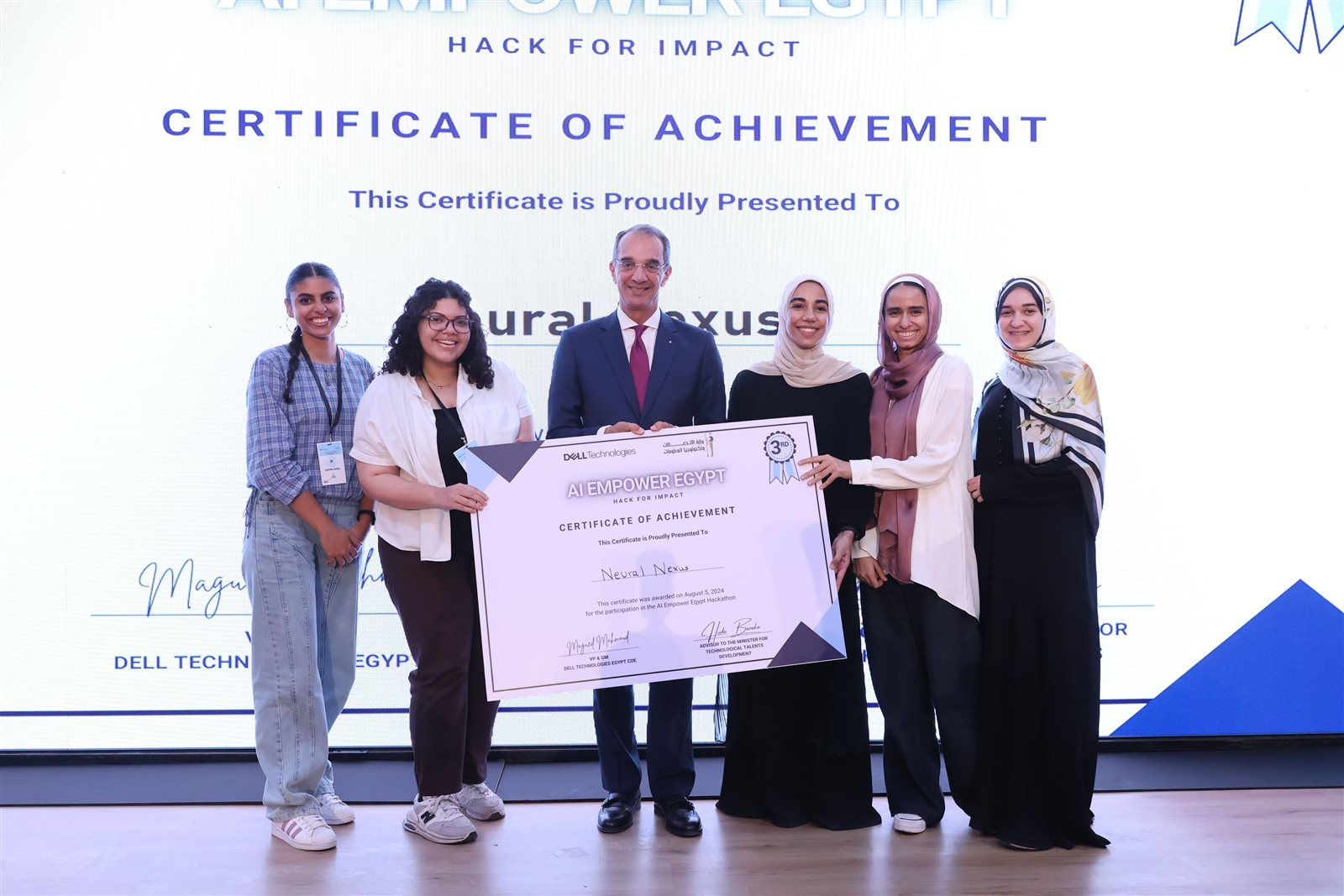 وخلال الحفل؛ قام الدكتور عمرو طلعت بتكريم الفرق الثلاث الفائزة فى الهاكثون؛ حيث حصد فريق code fellas من الجامعة الألمانية بالقاهرة، على المركز الأول، بينما فاز بالمركز الثانى فريق Enigma Ai من الجامعة الألمانية بالقاهرة؛ فيما فاز بالمركز الثالث فريق Neural nexus من جامعة عين شمس.
