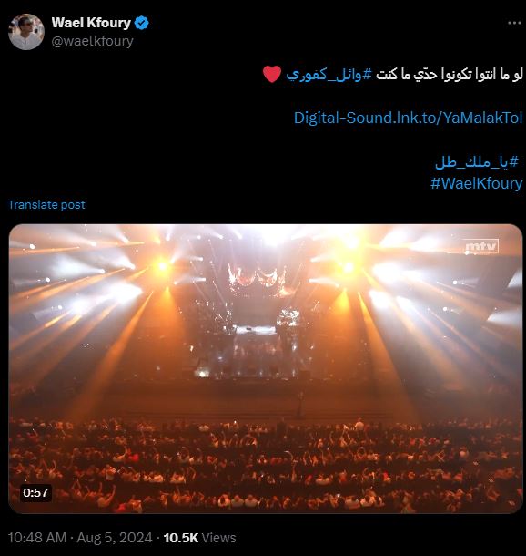 ونشر وائل كفوري فيديو من حفله الذي أحياه مؤخرًا في قرطاج وذلك ضمن فعاليات الدورة الـ 58 لمهرجان قرطاج الدولي، حيث شهد الحفل حضور جماهيري ضخم ، وعلق علية " لو ما انتوا تكونوا حدّي ما كنت وائل كفوري" .