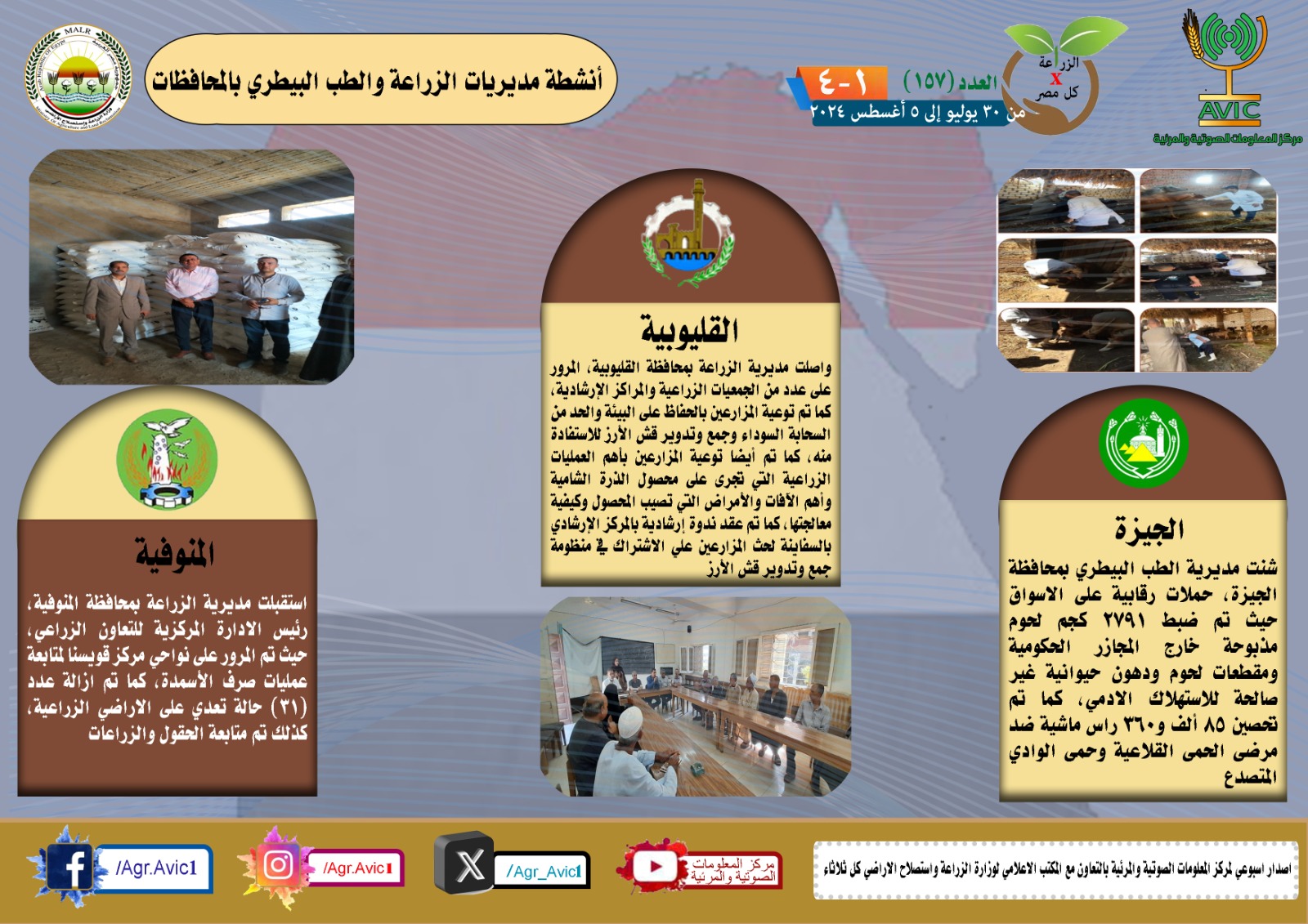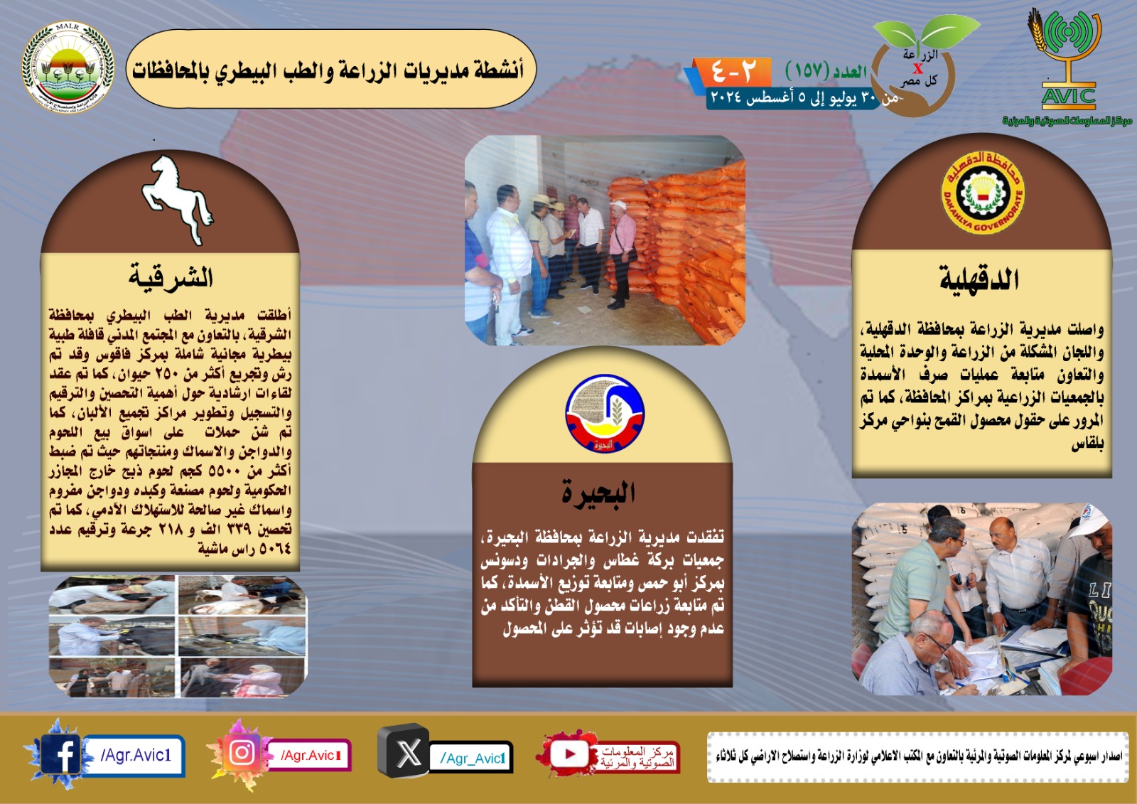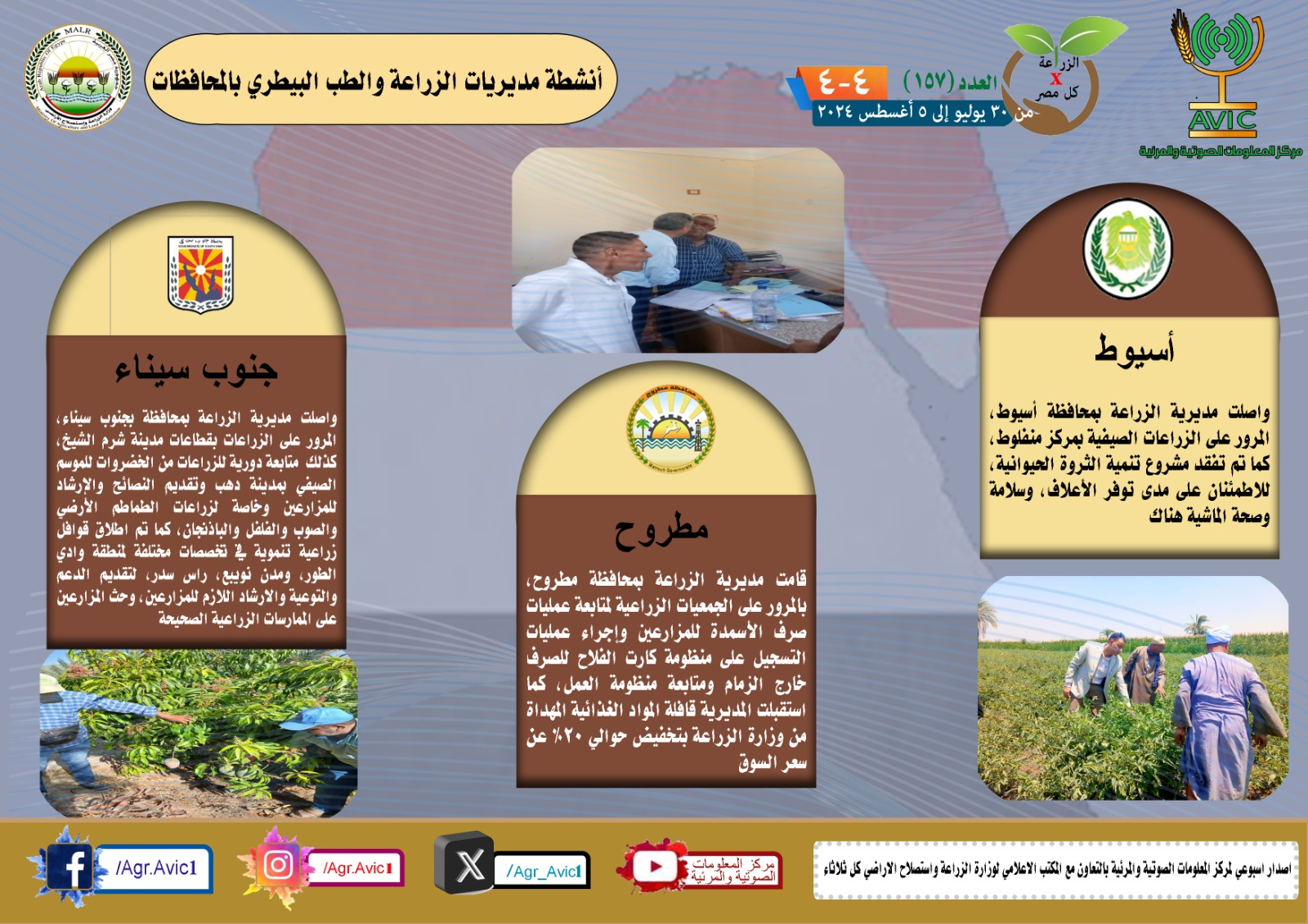 أصدر مركز المعلومات الصوتية والمرئية التابع لوزارة الزراعة واستصلاح الأراضي، والمكتب الاعلامي للوزارة، العدد رقم 157 من إصدار: "الزراعة في كل مصر" بالانفوجراف والفيديو، يوضح الجهود والانشطة التي تقوم بها مديريات الزراعة والطب البيطري بمحافظات الجمهورية خلال الفترة من 30 يوليو وحتى 5 أغسطس الجاري.