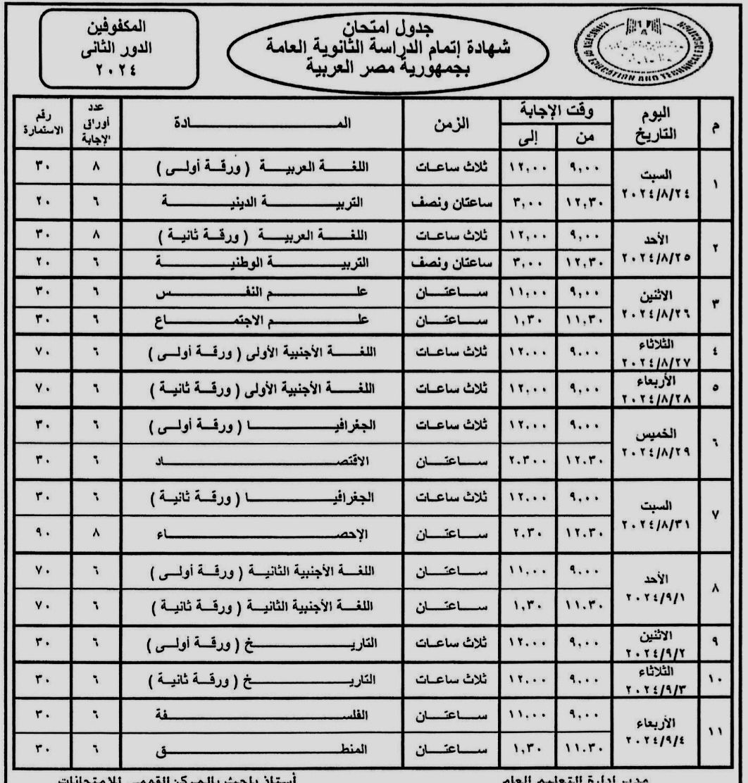 وزير التربية والتعليم يعتمد جدول امتحانات شهادة اتمام الثانوية العامة "الدور الثانى 2024"