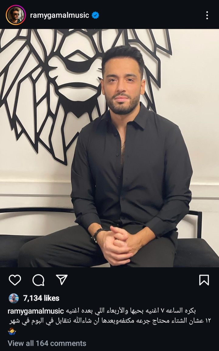 أعلن النجم رامي جمال عبر صفحته الرسمية " إنستجرام " ، عن طرح أغنيته الجديدة غدا وكتب" : "بكرة الساعة ٧ أغنية بحبها، والأربعاء اللي بعده أغنيه، وبعدها إن شاء الله نتقابل في ألبوم في شهر ١٢ عشان الشتاء محتاج جرعة مكثفة".