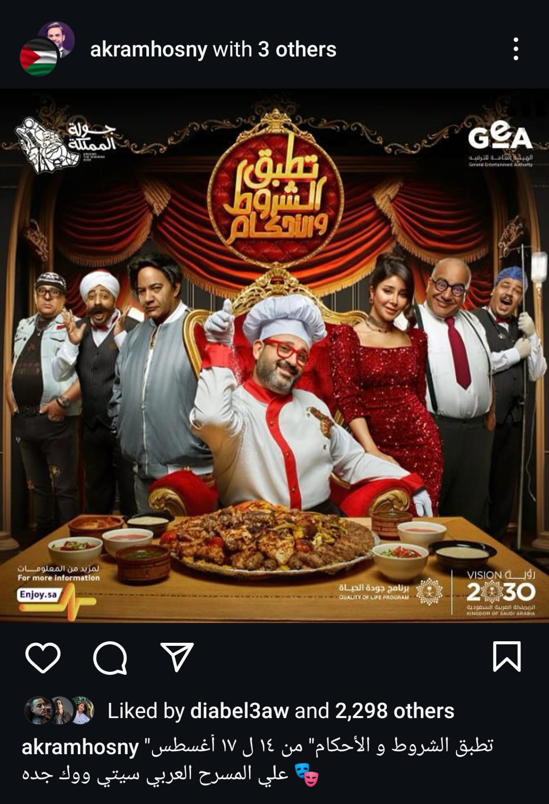 نشر أكرم حسني صورة البوستر الرسمي للمسرحية على صفحته الرسمية عبر موقع تبادل الصور والفيديوهات "إنستجرام" وعلق قائلا: "تطبق الشروط والأحكام، من 14 أغسطس لـ 17 أغسطس على المسرح العربي سيتي ووك جدة".