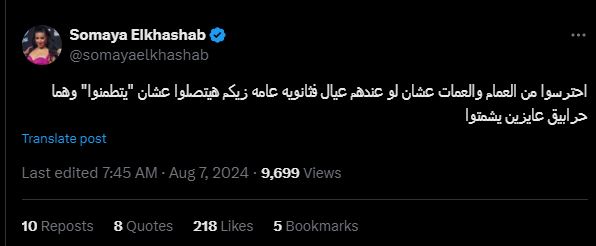 وكتبت سمية الخشاب عبر حسابها بموقع "إكس" للطلاب: "احترسوا من العمام والعمات عشان لو عندهم عيال في ثانوية عامة زيكم هيتصلوا عشان يطمنوا وهما حرابيق عايزين يشمتوا".