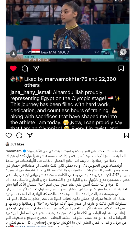 بعد محمد صلاح.. رامى عادل إمام يدعم جنا هانى بطلة الجمباز فى أولمبياد باريس
