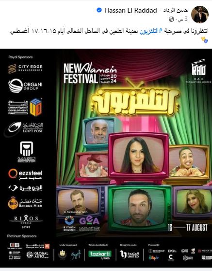 روجت الفنانة إيمي سمير غانم وحسن الرداد عبر صفحتها الرسمية لعرض مسرحية " التليفزيون " ، ضمن فعاليات مهرجان العلمين في دورته الثانية، التي تأتي ضمن التعاون بين الشركة المتحدة للخدمات الاعلامية وموسم الرياض وهيئة الترفيه السعودية، ويستمر عرضها لمدة 3 ليالٍ متتالية بداية من يوم 15 وحتى 17 من أغسطس الجاري.