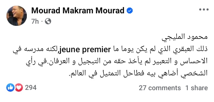 أشاد الفنان مراد مكرم بموهبة الراحل محمود المليجي وكتب عبر صفحته الرسمية " فيس بوك" محمود المليجي